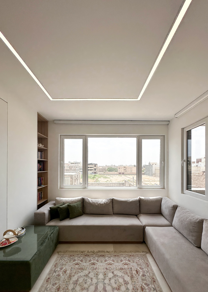 The residential design was driven by the client’s specific needs: a workspace, bedrooms for parents and children, and a dedicated room for the extended family, who frequently travel between Yazd and Tehran. This led to the creation of a duplex layout, carefully integrating both privacy and connectivity. While the clients requested large, light-filled windows, the architects had to balance natural illumination with privacy considerations, especially significant in Yazd, a city with strong cultural and religious norms.