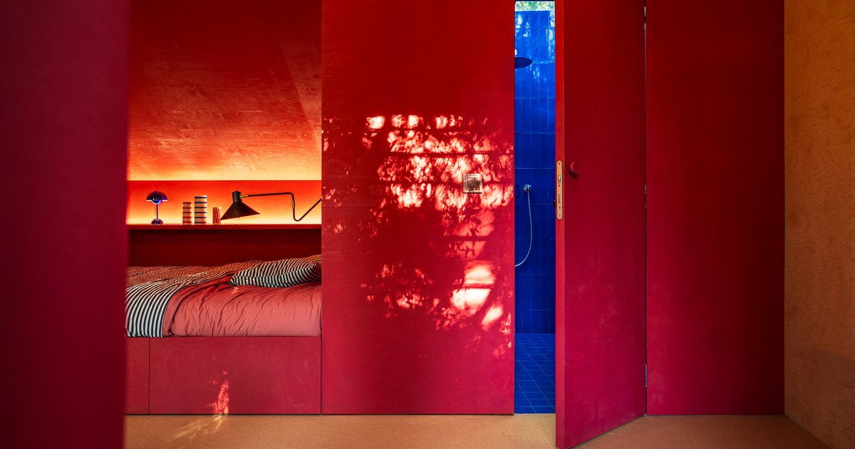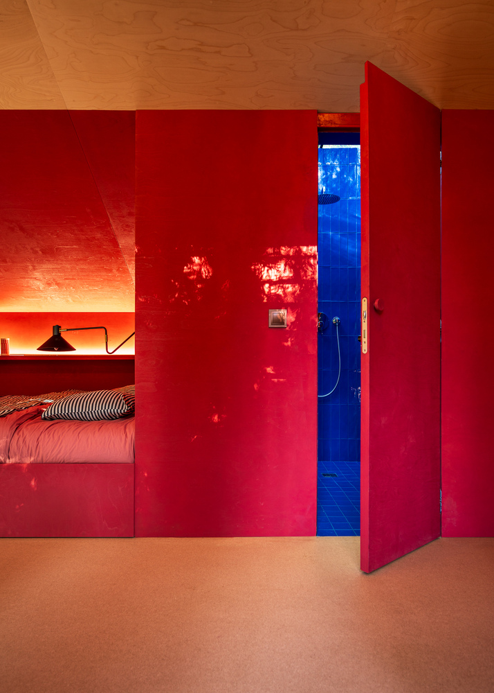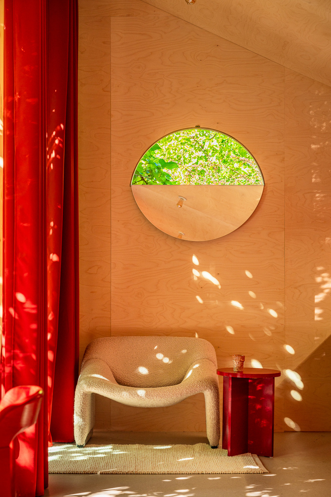 The interior reflects the couple’s love for bold aesthetics and artistic expression. The compact layout includes a living space, kitchen, workspace, sleeping nook, and bathroom, all seamlessly connected to the garden through expansive glazing. Natural plywood stained with eco-friendly oils lines the walls and ceilings, while raspberry shades dominate the window frames, curtains, and furnishings. These vibrant tones are harmonized by soft wood finishes, beige fabrics, and muted gray flooring, creating a balanced and organic interior.