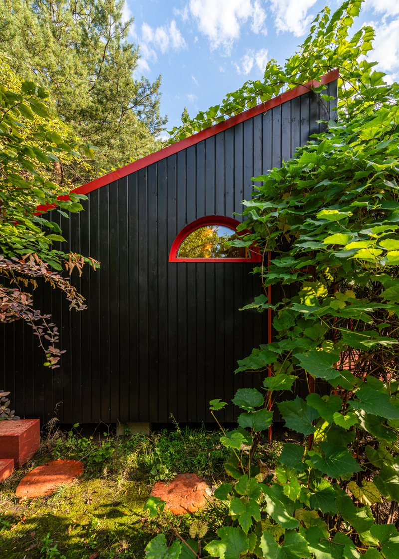 NOKE Architects, led by Karol Pasternak, Piotr Maciaszek, and Mateusz Jaworski, have masterfully captured the expressive personalities of Magda and Grzegorz in this project. What makes this house exceptional is its alignment with the broader trend of reclaiming urban allotment gardens as spaces for modern living. Once overlooked, these gardens are now seen as valuable green oases within the city. Magda and Grzegorz’s garden stands out with its custom-designed red gate adorned with the image of their beloved dog, Lusia. This gate is the only visible element from the alley, giving way to a hidden world of color and tranquility beyond.