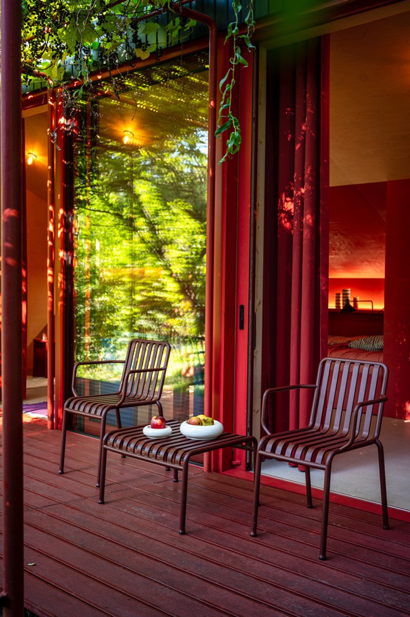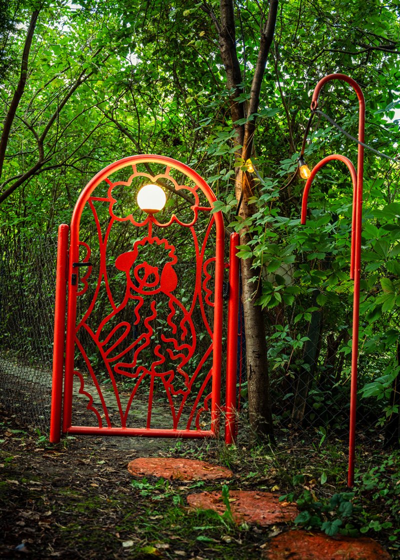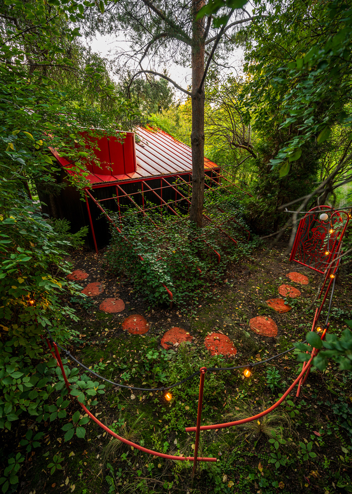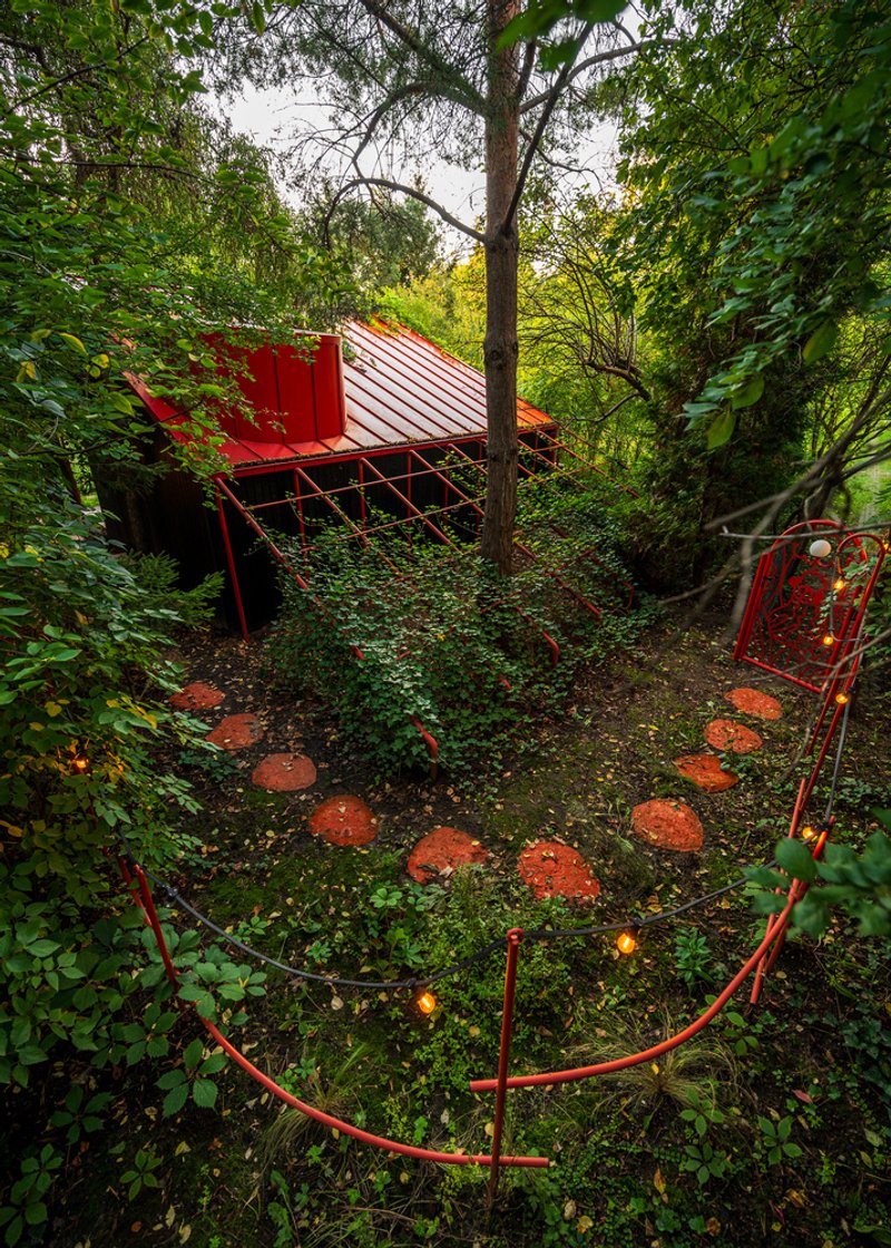 From the striking pink gate, a winding path of red stones leads to the heart of the garden. A luminous art installation guides the way, enhancing the magical atmosphere. The cottage itself is designed to blend with its surroundings over time, with vines set to envelop the structure, leaving only the distinctive red bathroom chimney visible. Hidden entrance doors are marked subtly by three cast concrete steps that resemble a sculptural garden element. Once inside, the space opens up with large glass panels and a spacious terrace shaded by an 80-year-old grapevine, which was carefully preserved and integrated into the design.