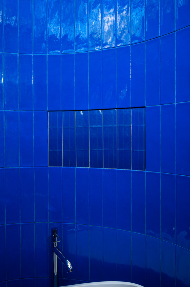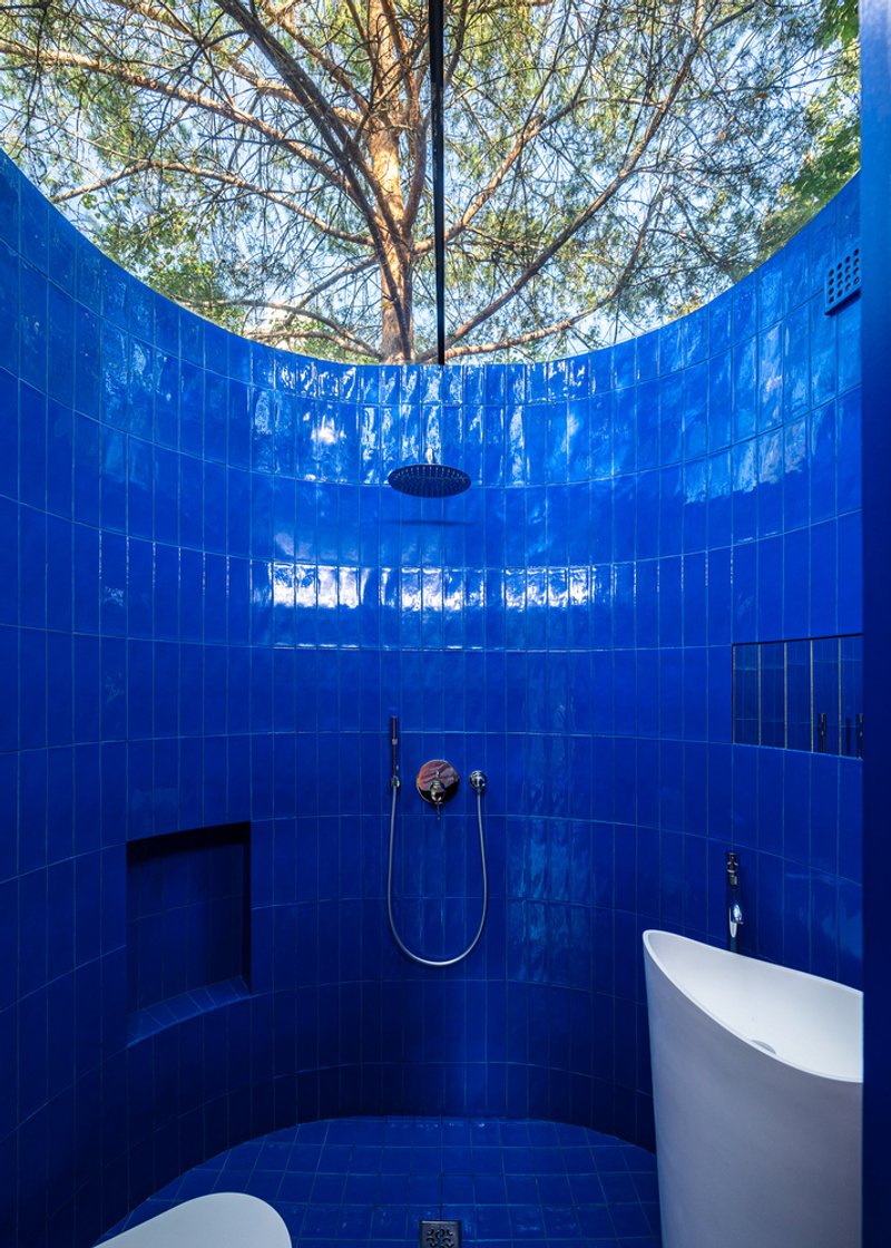A semicircular window next to the kitchen offers a playful element, allowing additional views of the garden when the shutter is opened. The bathroom, enclosed in the red chimney, surprises with its oval shape, glossy cobalt tiles, and glass roof, offering stunning views of the Warsaw night sky. This fusion of function and art exemplifies the architects’ commitment to infusing every element with meaning and delight.