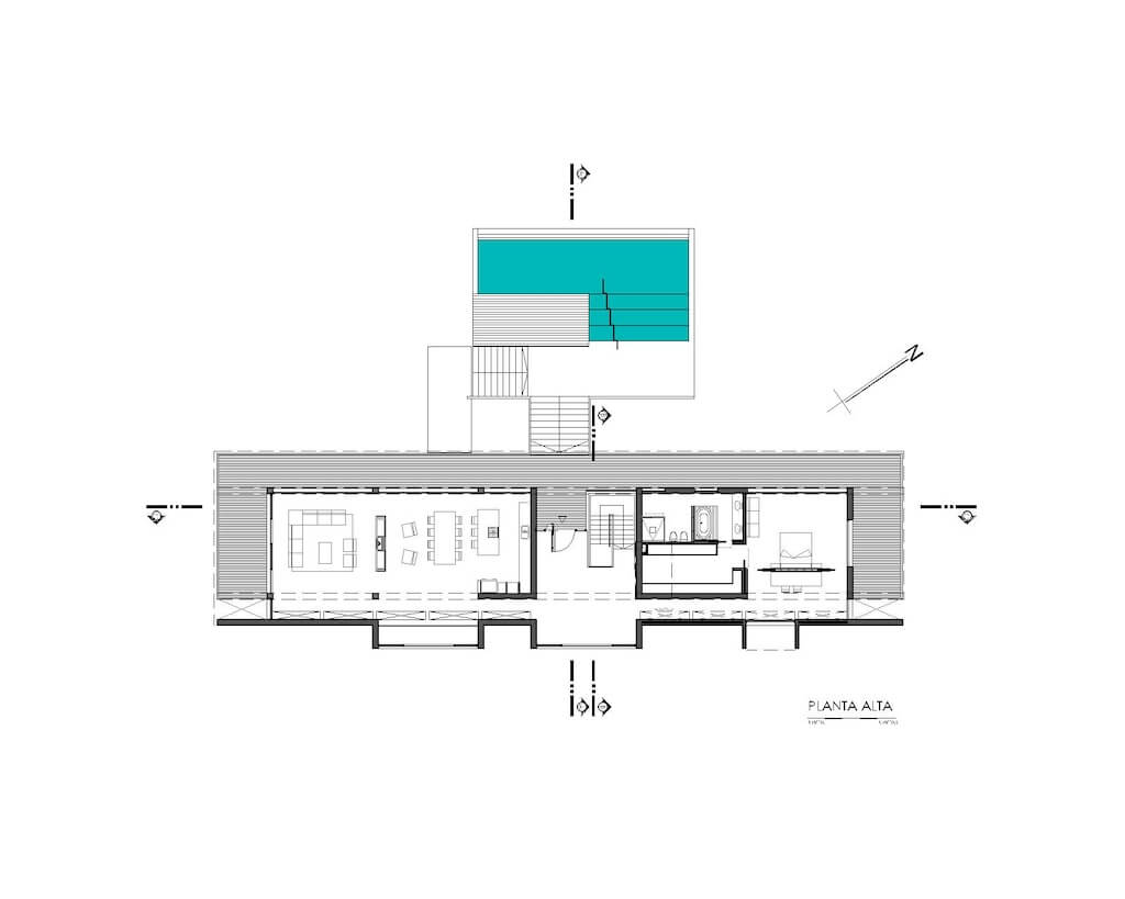 In House on El Dragón, structure and architecture are inseparable. The cyclopean base supports an upper volume that extends outward to create shaded galleries along nearly all façades. On the southern side, a cantilevered internal circulation corridor runs longitudinally, protected by a suspended partition that filters light and frames selected views. This passage is punctuated by three large concrete volumes that act as visual anchors, choreographing movement while allowing overhead daylight to penetrate deep into the interior.