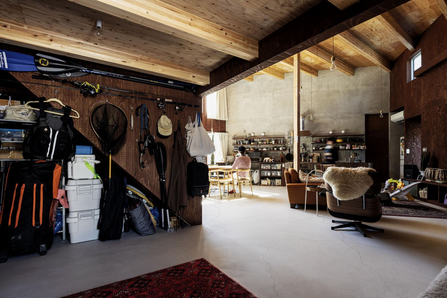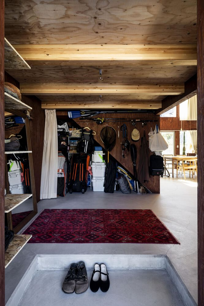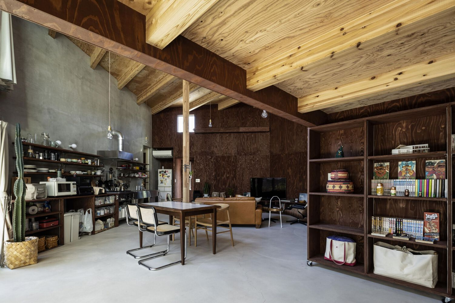 The interiors, captured by Shinichi Hanaoka, showcase exposed beams, warm wooden textures, and minimalist furnishings. The open-plan design encourages a seamless flow between living, dining, and kitchen spaces, while built-in shelving and carefully placed furniture create functional yet flexible zones.