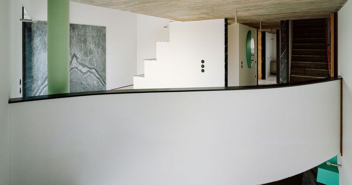 Inside, the architecture intentionally resists predictability. The building’s structural system is revealed through five slender, light green concrete columns, each appearing in unexpected locations and even interrupting daily movement. One column on the terrace stands as a visual gesture, supporting nothing, blurring the line between structural necessity and artistic expression.