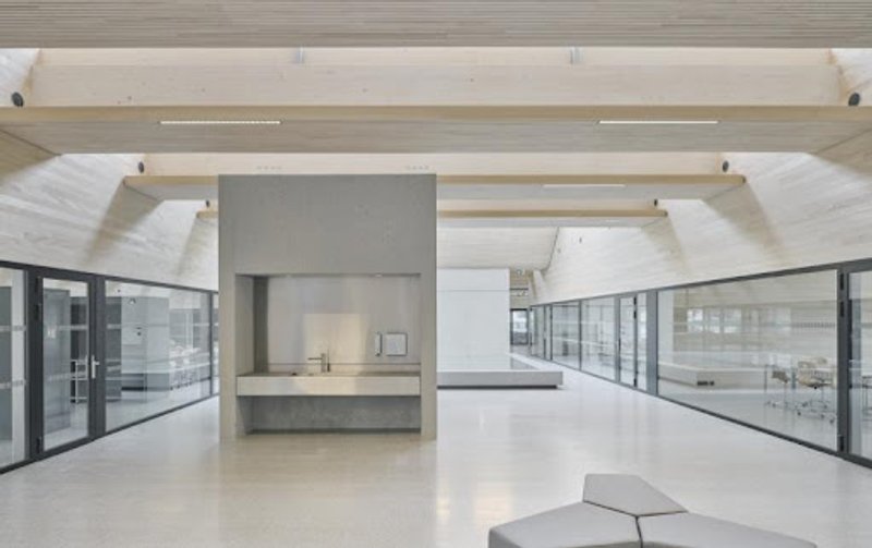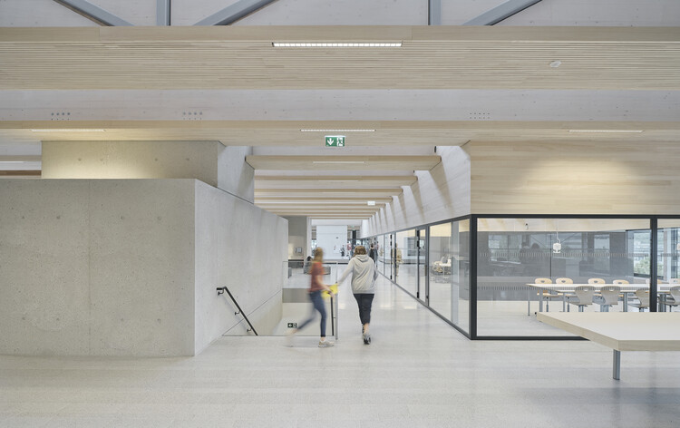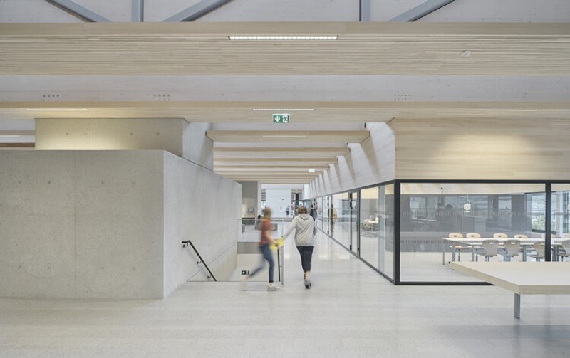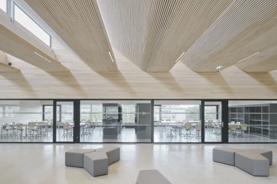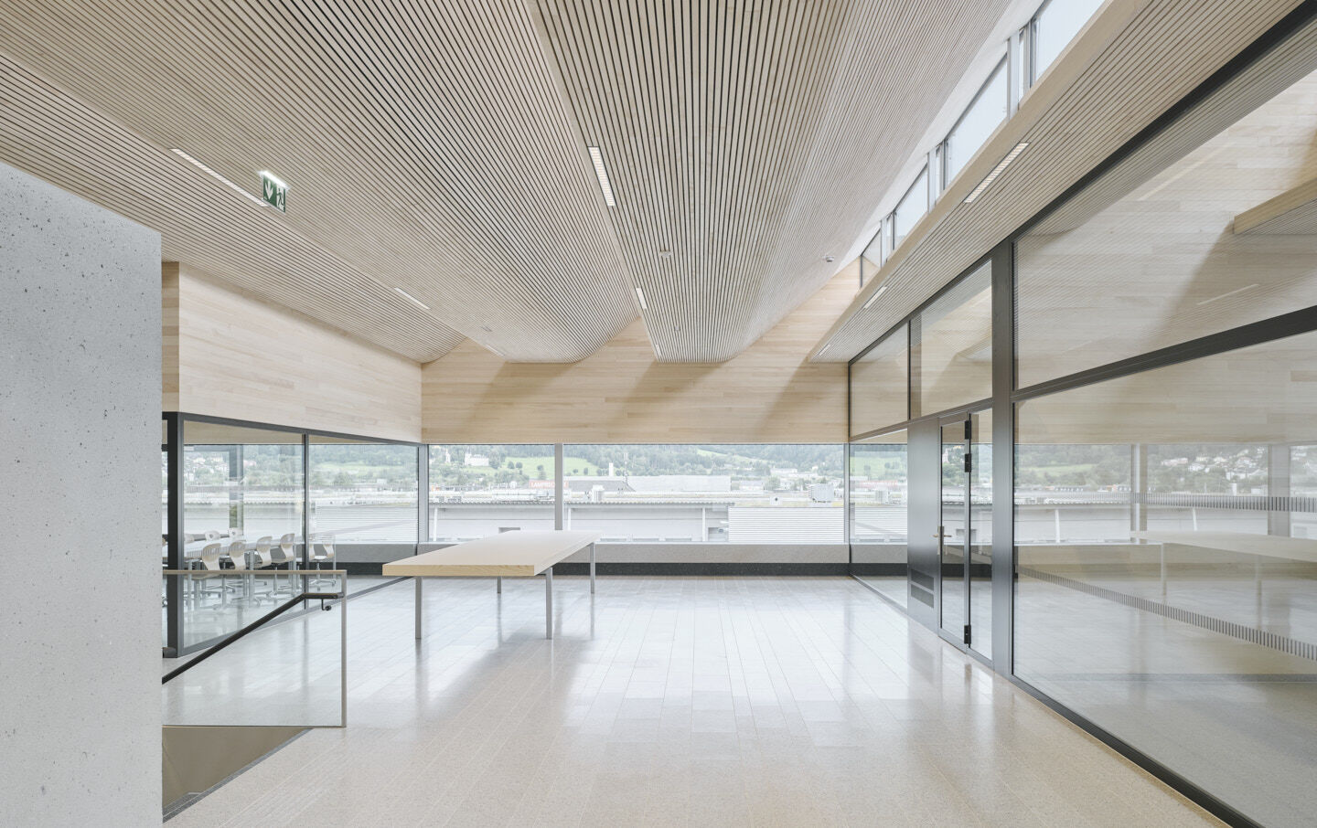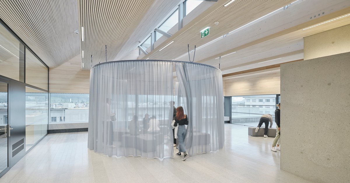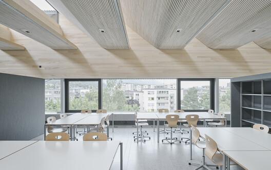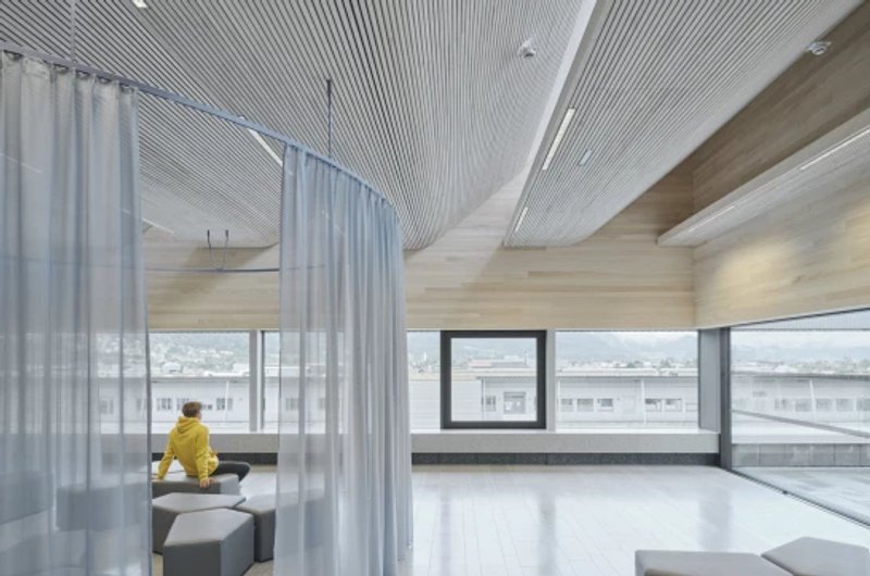 The new interior emphasizes open, transparent layouts that foster collaboration. Continuous ribbon windows wrap around the floor, offering panoramic views over Innsbruck while maximizing natural daylight. A lamella-style roof supported by minimal pillars ensures shadow-free, evenly balanced lighting, creating a bright, studio-like ambiance ideal for design-focused learning.