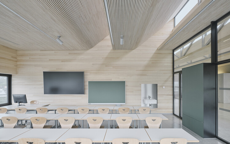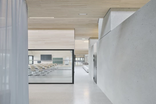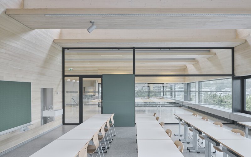 The school complex consists of a main building to the north and workshops to the south, positioned between the bustling Bachlechnerstraße to the east and a large commercial building to the west. ao-architekten introduced a single-story extension that expands the teaching and administrative wing, blending harmoniously with the existing structure while providing a fresh architectural identity.