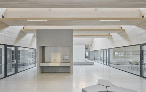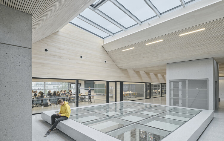 The design embraces a mix of light-filled interiors, concrete textures, and glass transparency, reinforcing both resilience and openness. The architecture prioritizes natural light, acoustic comfort, and adaptability, ensuring that students and educators alike experience a high-quality environment tailored to creative education.
