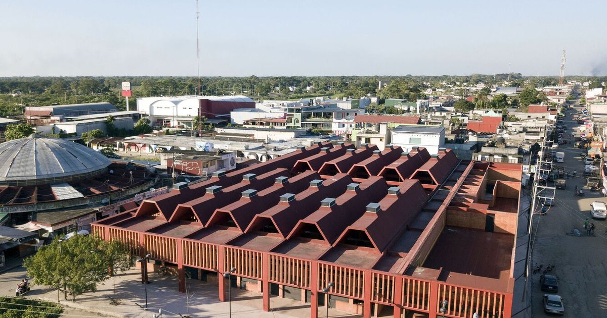 Huimanguillo Market blends modern and traditional architecture, featuring passive cooling, vaulted concrete shells, and urban integration for a sustainable marketplace.