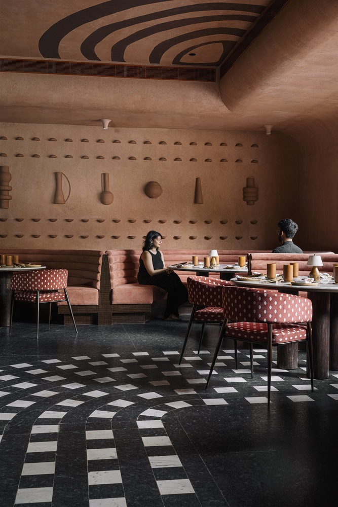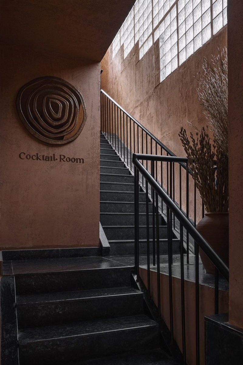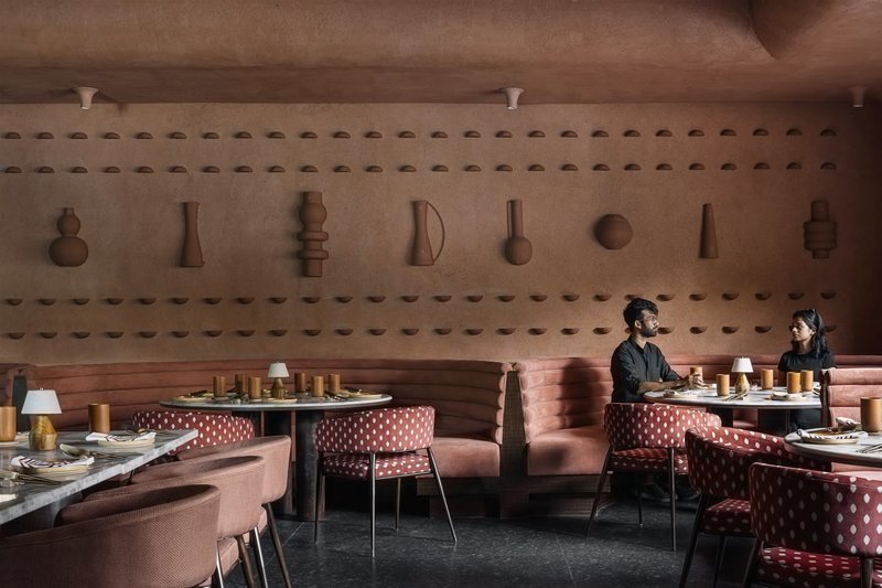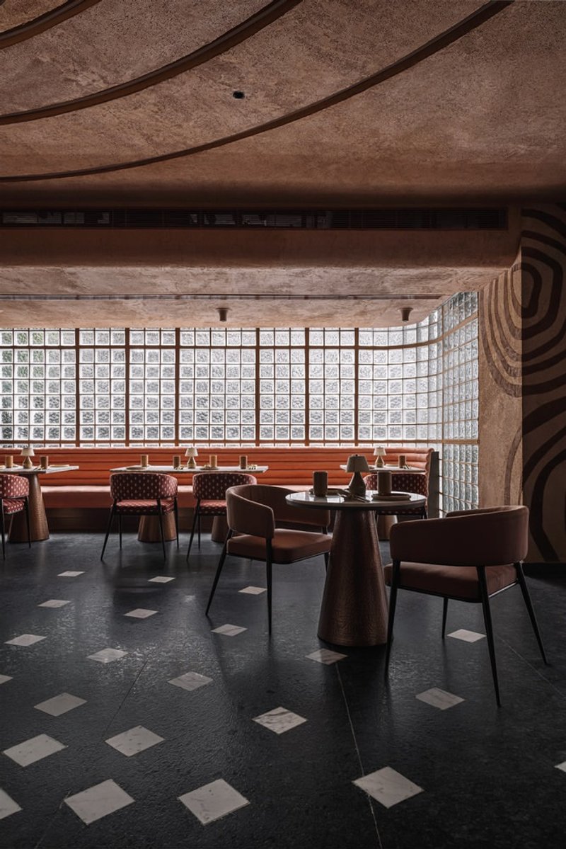 The interiors emphasize monolithic monotone walls, granite and white marble flooring, and earth-inspired textures. Frescos, intricate Indian motifs, and carefully positioned lighting bring depth and visual intrigue, while fabrics and soft furnishings introduce warmth and comfort. The design balances bold architectural statements with subtle detailing, creating a harmonious environment that elevates the dining experience.