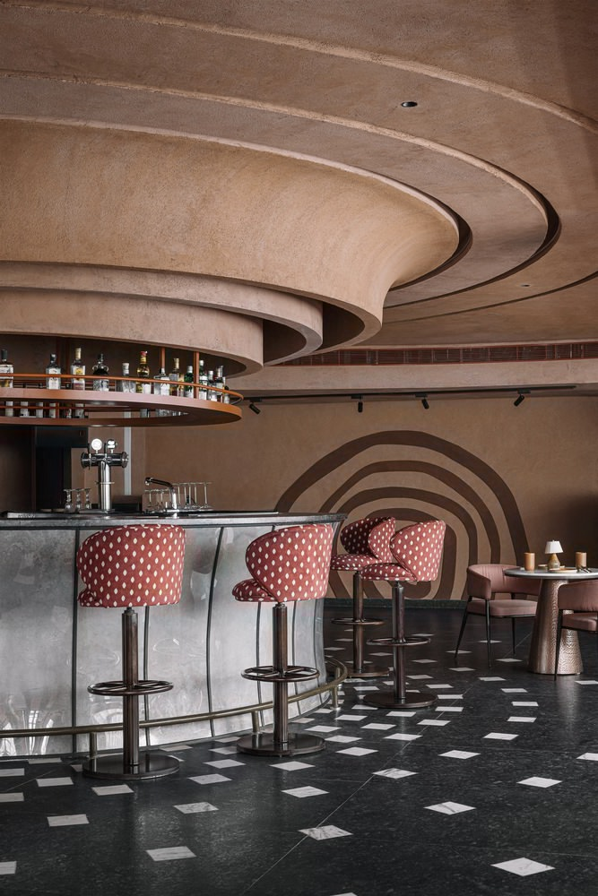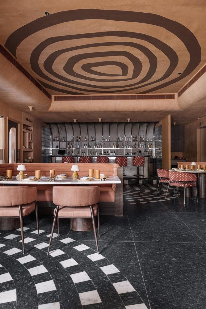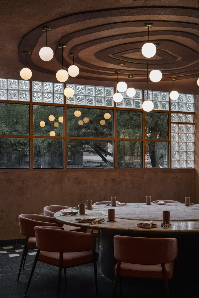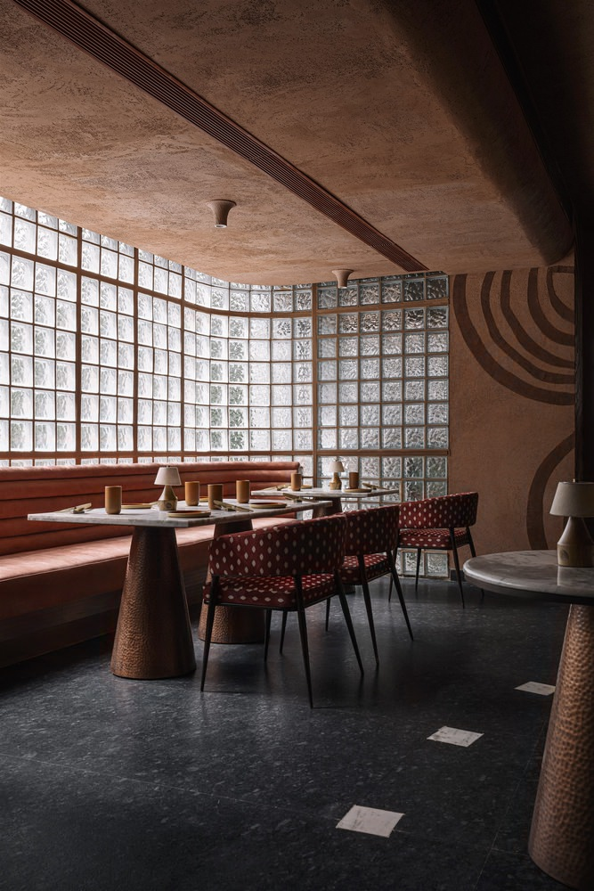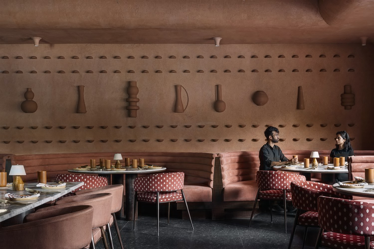 Indian cuisine is inherently diverse, and the restaurant’s design mirrors this multiplicity. Every material, texture, and color has been carefully selected to honor the intricate artistry of Indian culture while creating a harmonious, immersive dining environment. From the tactile quality of earth-inspired surfaces to monolithic walls and ceiling frescos, the architecture and interiors engage guests in a narrative that blends tradition with modernity.
