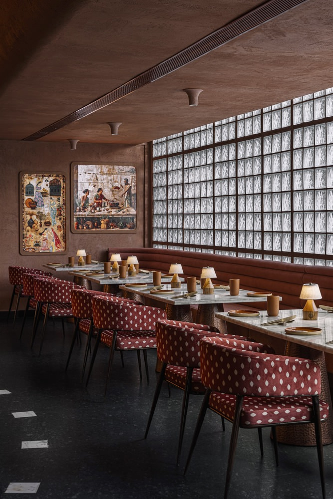 From the ceiling frescos symbolizing tree rings to granite floors reminiscent of southern Indian monoliths, every detail is infused with cultural significance. The result is a restaurant that not only serves food but tells a story of tradition, craftsmanship, and contemporary design sensibilities.