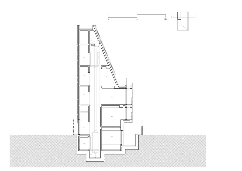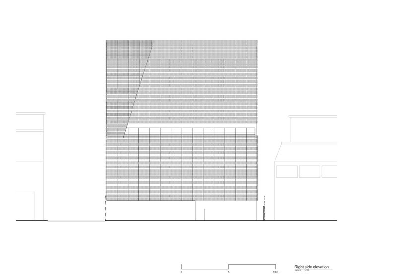 The facade features 25mm thick bricks arranged in a pattern set by a minimum module of 430mm. This modular approach not only achieves a high degree of precision but also contributes to the facade’s visual rhythm. The metal structure binding the bricks follows intervals of 1,210mm, wrapping the entire building in a continuous, undulating wave of brick.
