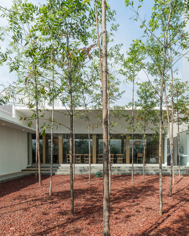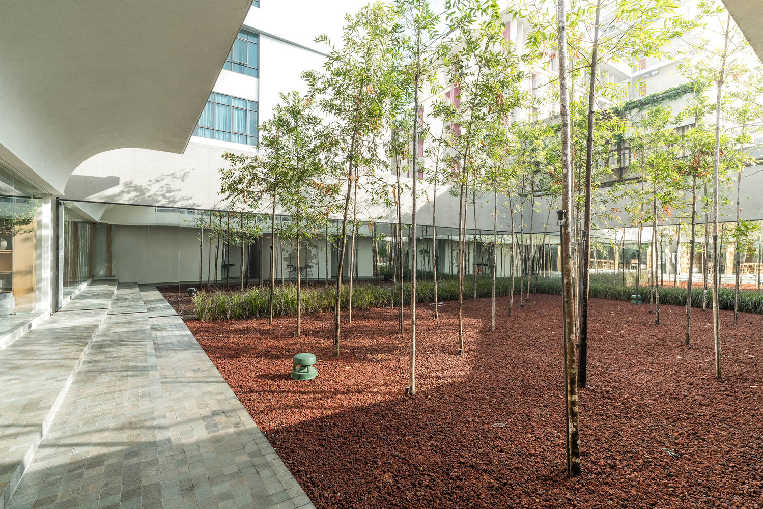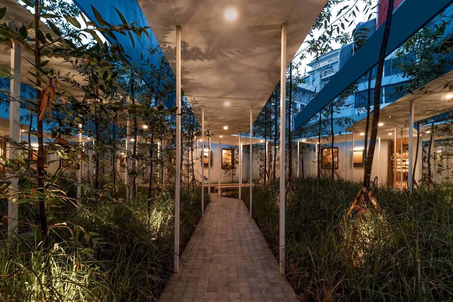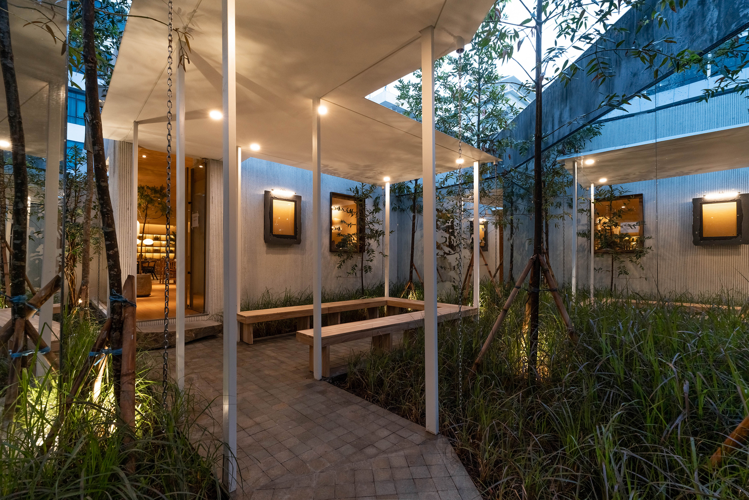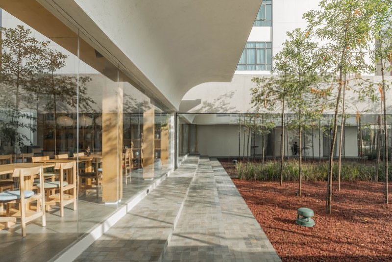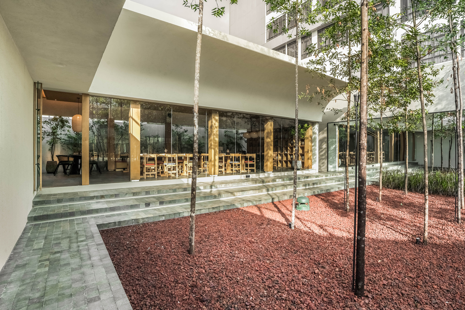 The spatial journey within BYASA Cafe culminates in an unexpected open area, a serene escape filled with trees and surrounded by reflective surfaces. This space, a fusion of nature and architecture, offers a moment of respite from the urban environment, allowing visitors to immerse themselves in a tranquil, secluded haven.