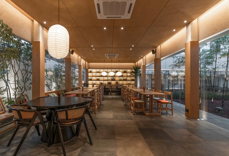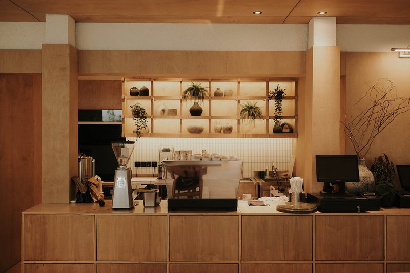 The cafe's interior is a meticulous blend of rustic charm and modern simplicity, where every element contributes to a cohesive aesthetic. Warm lighting, natural materials, and a carefully chosen decor create an environment that feels both intimate and expansive. The design employs an intense repetition of materials and vertical elements, enhancing the spatial experience while maintaining a connection with the natural world.
