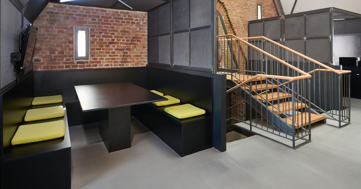At the heart of DOJO's office is a striking cubic seating area, adorned in black with vivid slime green cushions, creating a vibrant contrast that captures the eye. Flanked by staircases and crowned with a symmetrical dome, this central space pays homage to the building's ecclesiastical origins while serving as a dynamic hub for creativity and collaboration.