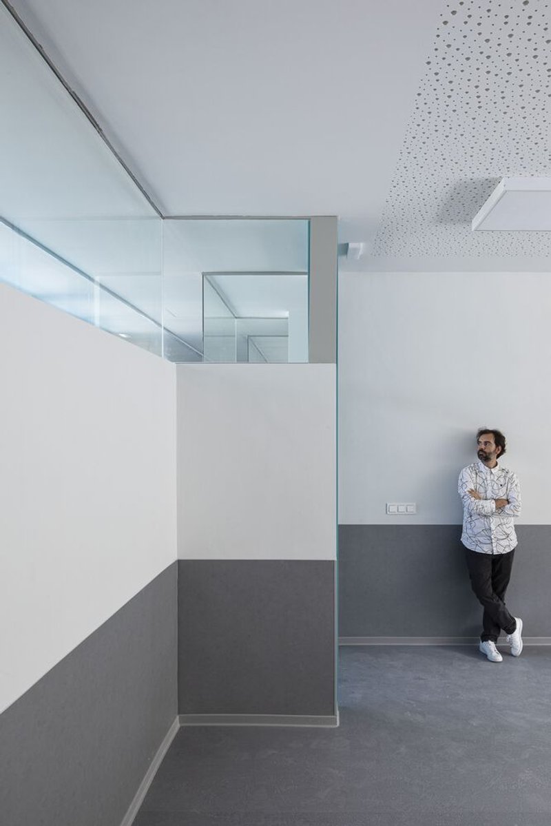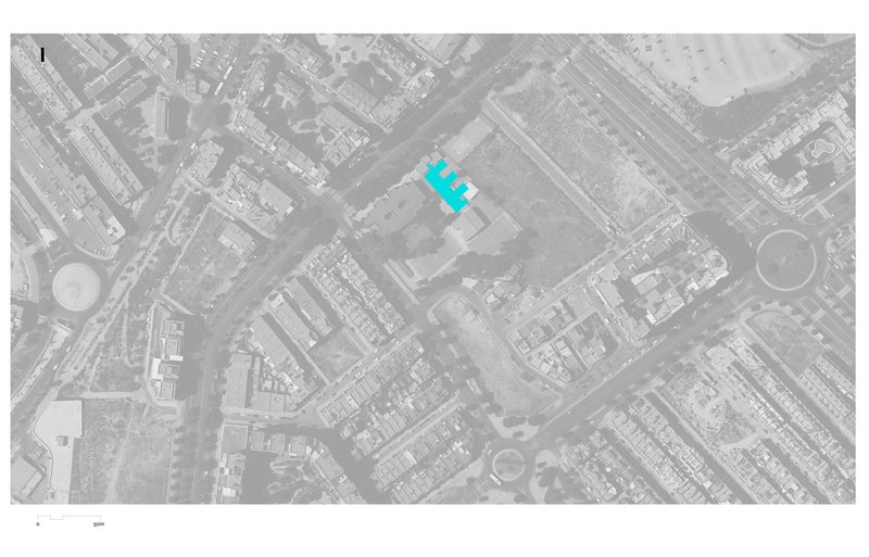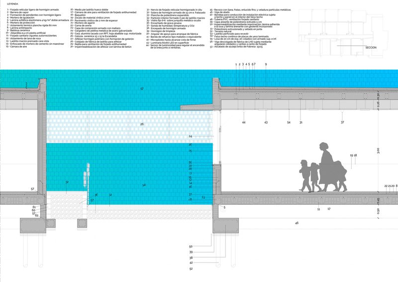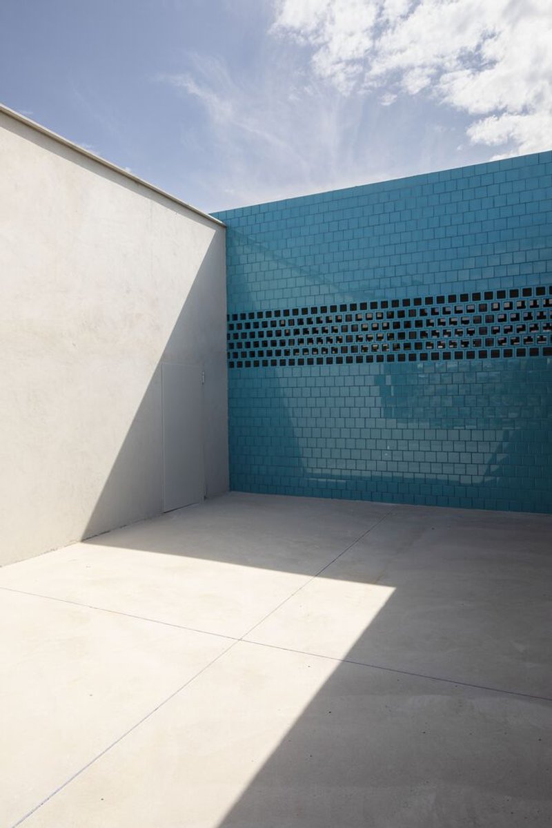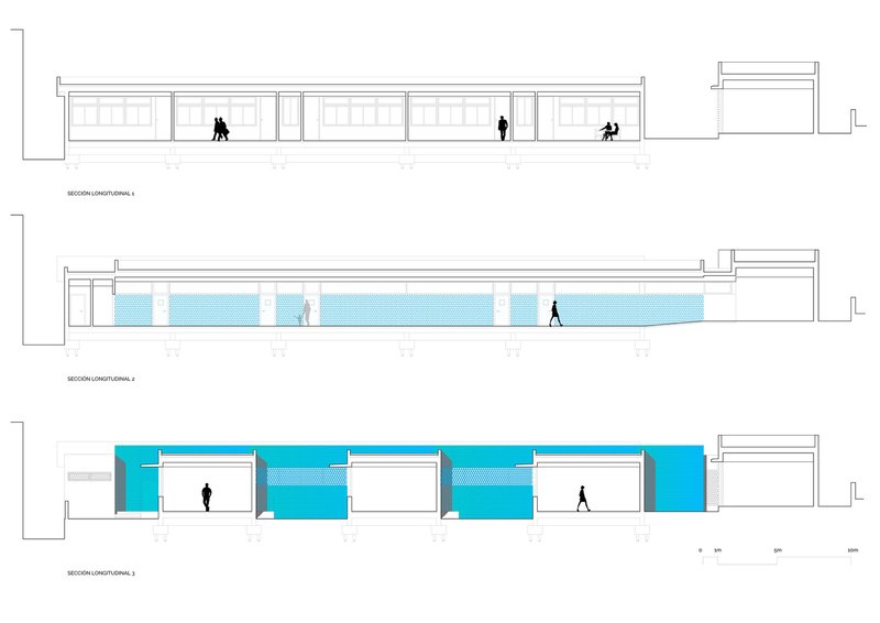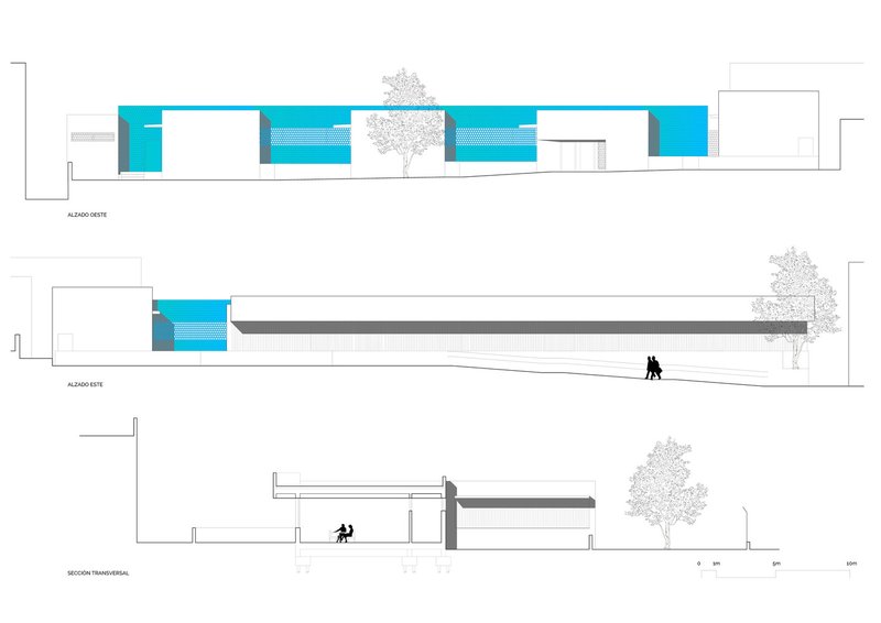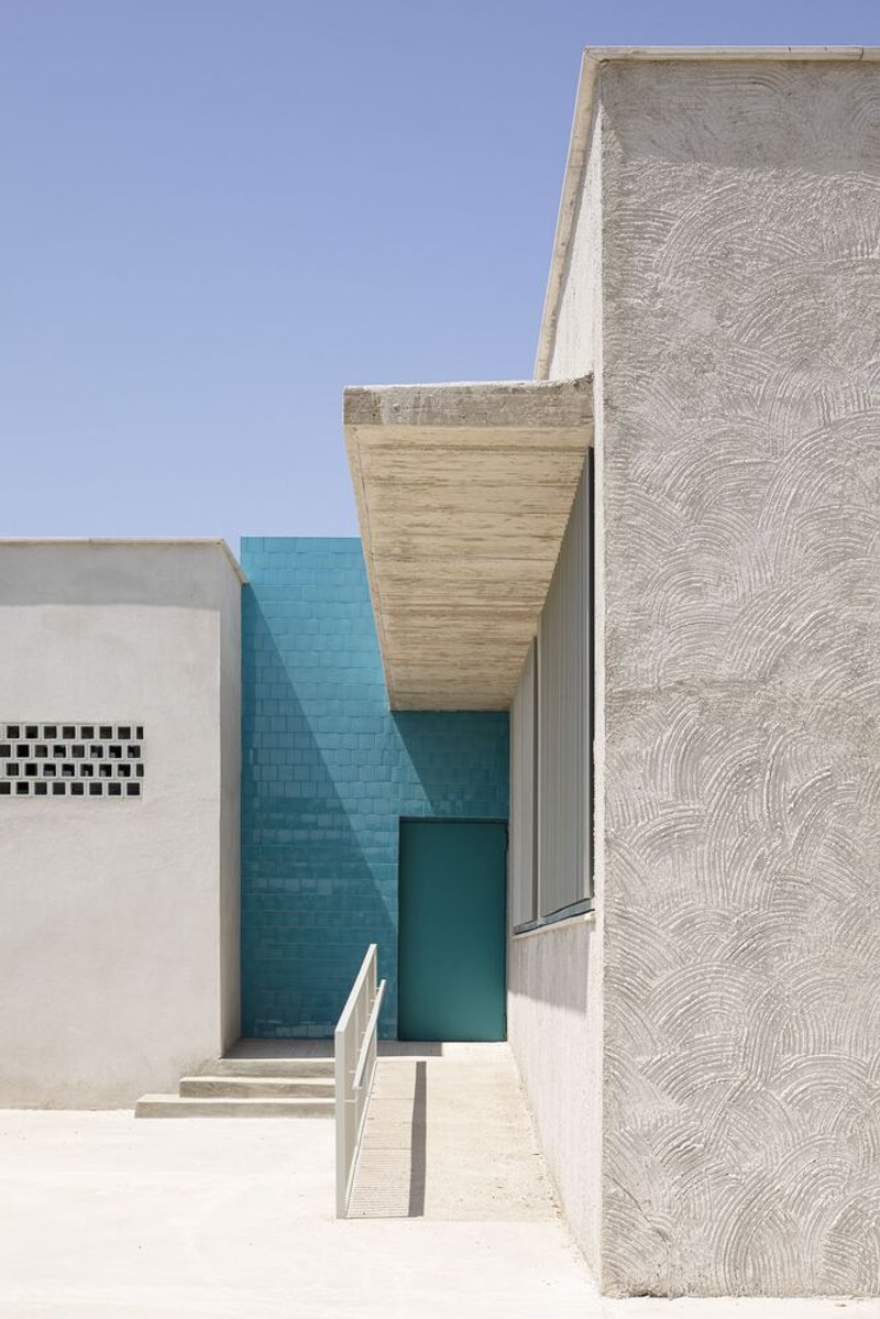 The architects employed a palette of materials and colors that reflect the maritime character of Almería. The central spine of the building is adorned with glazed tiles in turquoise tones, offering a vibrant contrast to the earthy and stone textures of the exterior walls. This choice of materials not only serves functional purposes, such as solar protection, but also adds a layer of aesthetic depth to the building's design.
