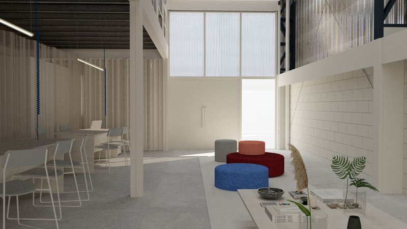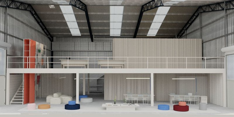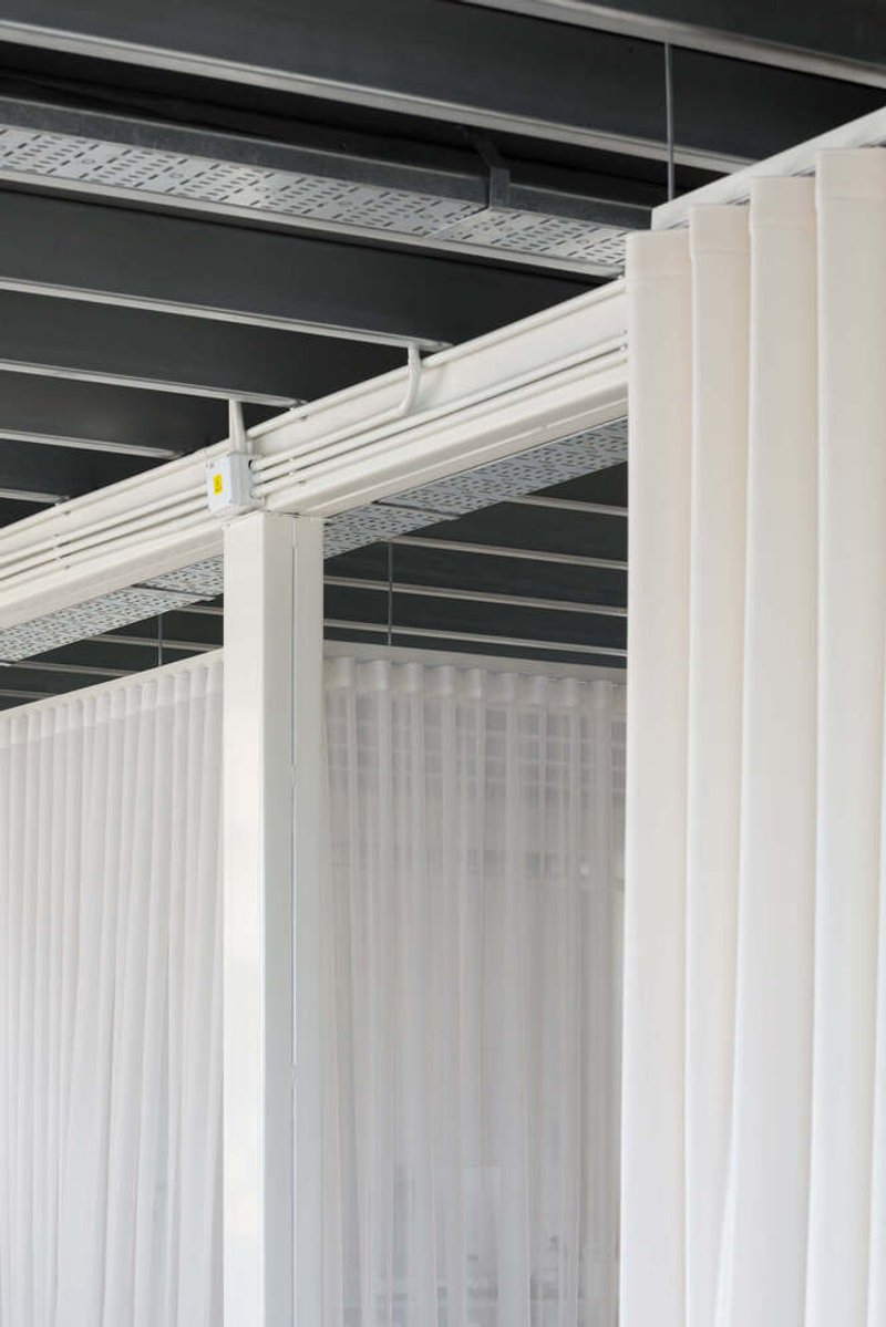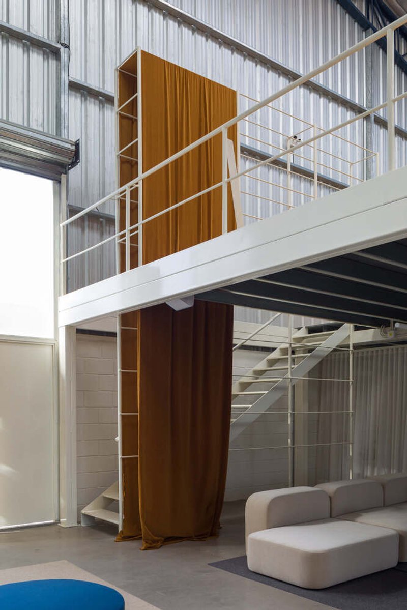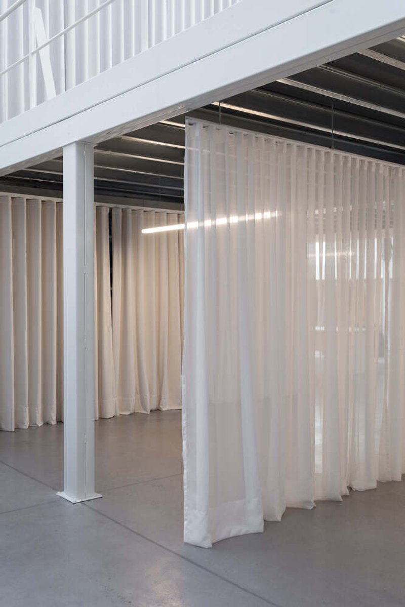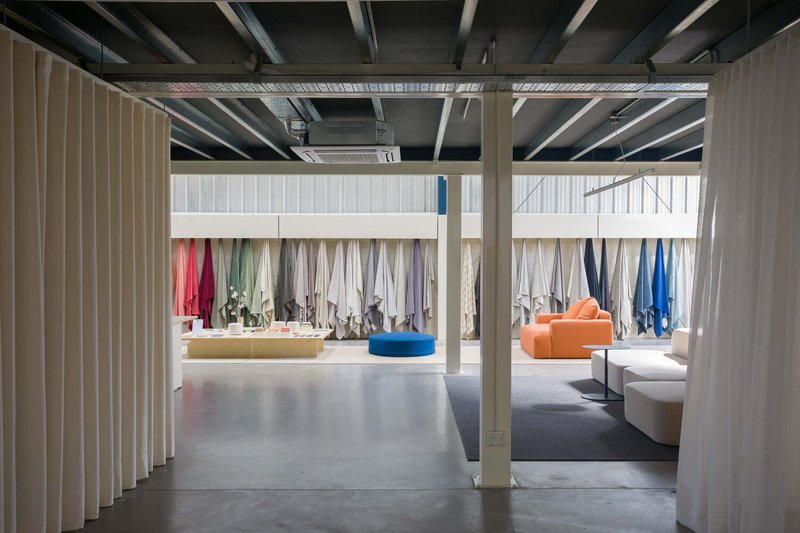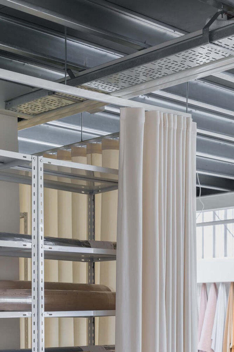 A series of strategically placed curtains serve multiple purposes: they divide the space, create a private meeting room, conceal shelves filled with orders, and gracefully cover the storage areas. This innovative use of fabric as a space-defining element emphasizes the showroom's core product while adding an element of softness and flexibility to the industrial backdrop.