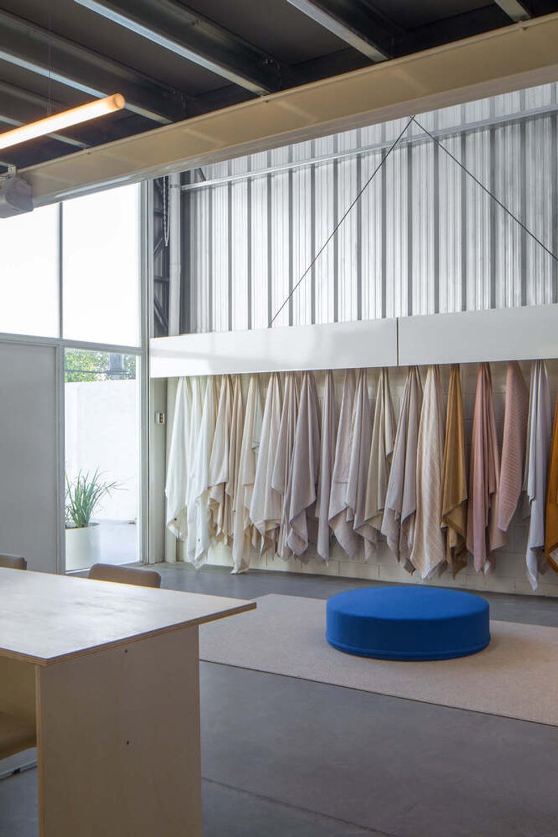 The architects embarked on creating a multifunctional space that serves as an exhibition, work, and storage area for the fabric brand. The design leverages the raw material of the place—fabric—to define spaces, create privacy, and add a layer of texture and warmth to the interior.