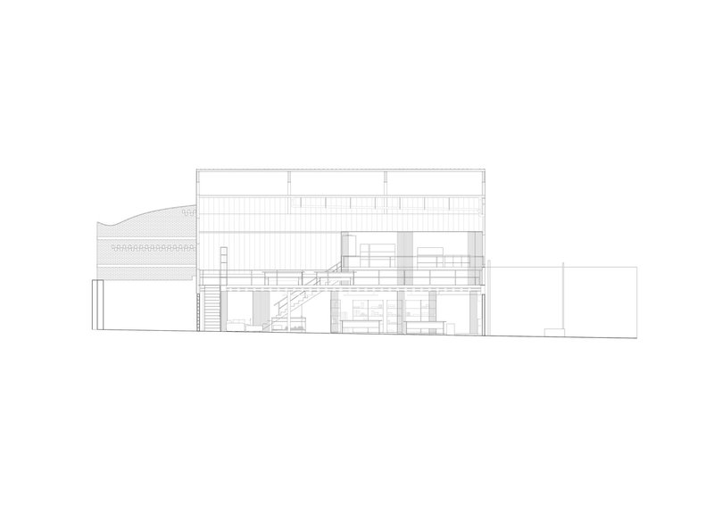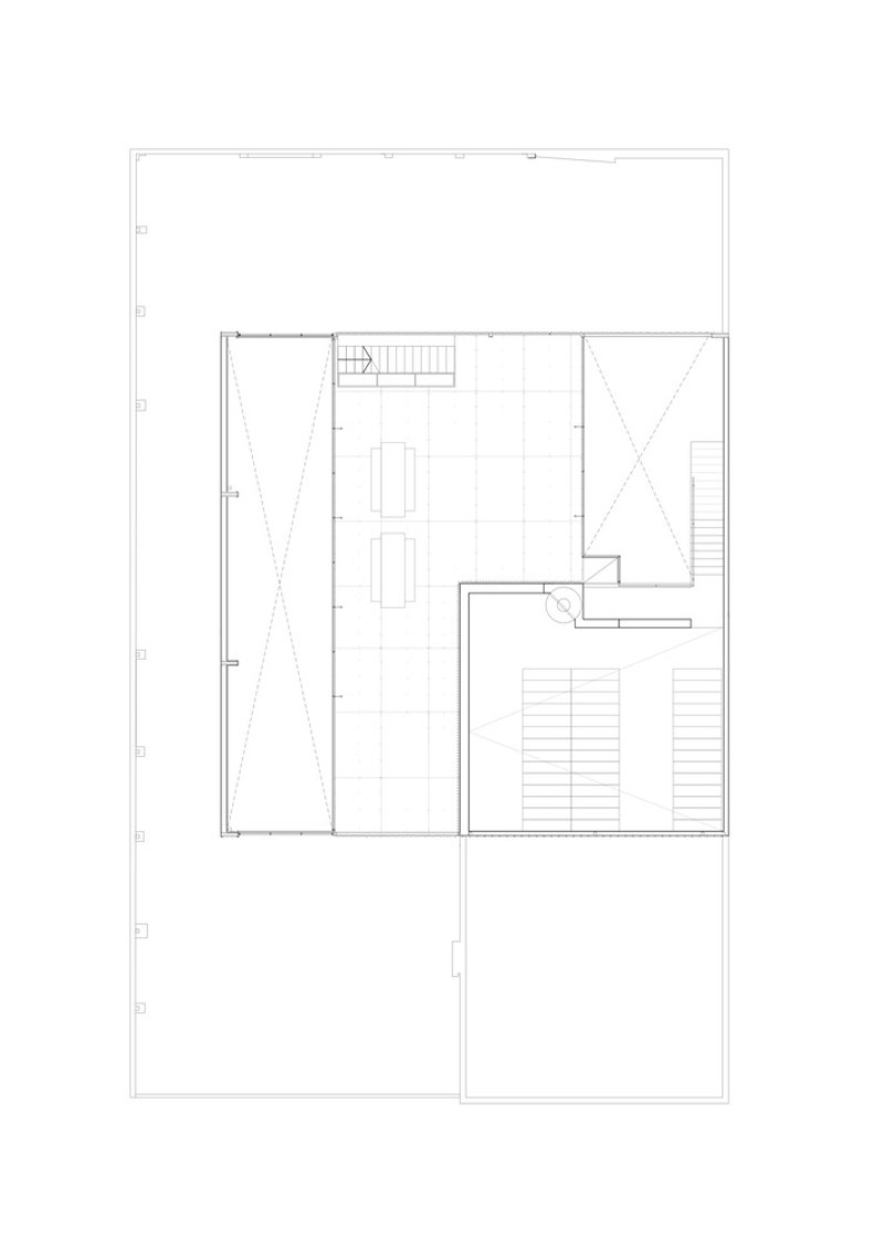 Central to the showroom's design is a metal mezzanine that introduces scale and separation between the different functions of the space. Below this mezzanine lies the bustling workspace, complete with tables for design and production, and a customer area designed for interaction and engagement. Above, the mezzanine expands into a storage area, efficiently utilizing the vertical space for fabric inventory.