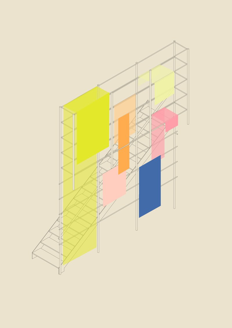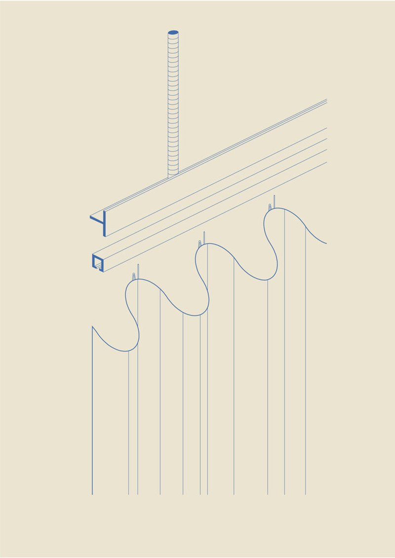 An intriguing feature of the showroom is the ladder-device, designed as an exhibition element. From this structure, a velvet fabric cascades, connecting the two levels in a symbolic and functional manner. This ladder-hanger acts as an internal display window, showcasing the fabric selection that can be altered seasonally, demonstrating the versatility and seasonal adaptability of the showroom's offerings.