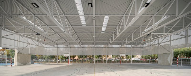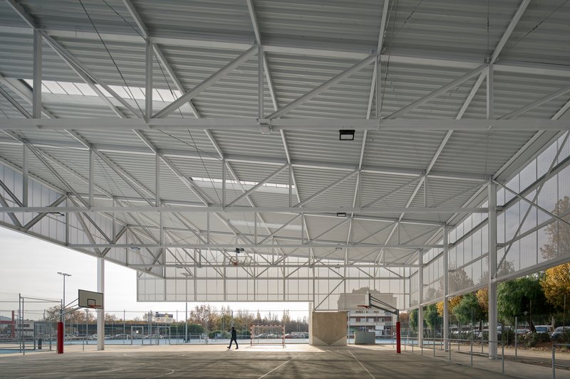 The standout feature of the complex is undoubtedly its canopy. Designed to cover the multi-sports court without fully enclosing it, the canopy exudes an aura of weightlessness. The clever use of white metallic elements supported by concrete screens and steel pillars allows the structure to seemingly float above its supports. This design choice is a brilliant example of how innovative sports complex design can achieve aesthetic beauty without sacrificing functionality.