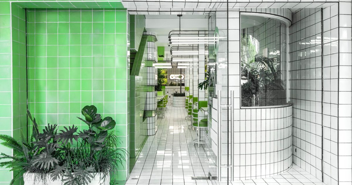 With a clear intent to define what a vegan hospitality space should embody, RENESA opted for a pared-down design language that highlights the café's identity. The façade, a playful matrix of white and green tiles, invites curiosity, while inside, a bold monochrome palette with lime green accents creates a vivid, engaging environment.