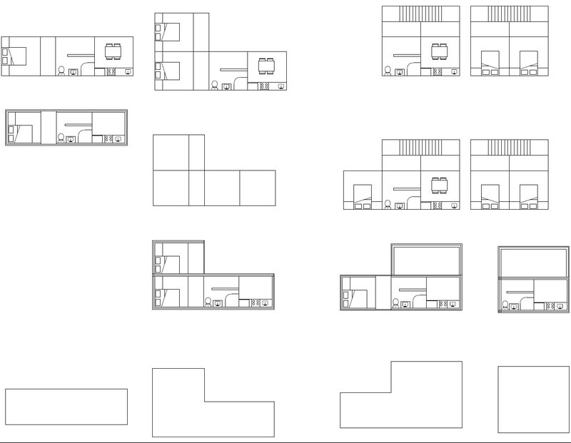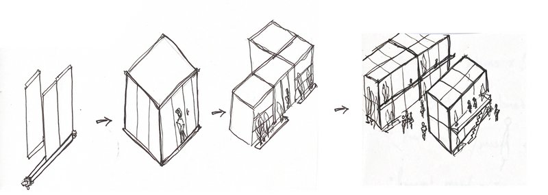 All aspects of the design have been carefully detailed and experimented in order to achieve the most flexibility in function. The aluminum structure is composed of a singular member type, dimensioning 3 meters in length. This aluminum element can be used as both a column or a beam as the grooves on its two sides determine the vertical or horizontal orientation of wall panels. The structural elements are then adhered with 3D printed plastic joints that allow for the framing to be stacked and for rooms to be connected. There are four types of panels used to construct enclosures between rooms, all with identical dimensions and connections. The standard panel is fabricated from cork encased in a translucent fiberglass shell. The second is a moveable door panel with the same structure as the standard panel. However, this panel is equipped with a handle and locking system and situates itself on the outer grooves of the structural members allowing it to slide back and forth. The third is a moveable window-type panel composed of only the fiberglass shell and installed with a fixed netting. While being configured in a horizontal direction, the window system is designed to slide up and down by being installed similar to the door panels. Lastly, the plumbing wall is a thicker panel that allows for plumbing systems to pass through from the kitchen and washroom out into the collection pods outside the units. The assembly also includes plastic floor and roof boards that latch onto the structure and self supporting staircases designed for two-story units. Using prefabricated and multifunctional components is how the design maintains modularity in its spaces. There is only one set of room dimensions which is the result of the goal to optimize stackability and conjunction in the interlocking systems. With this design, any room can be transformed to another. Wall panels can be replaced by doors panels, or completely removed to expand the size of the room.