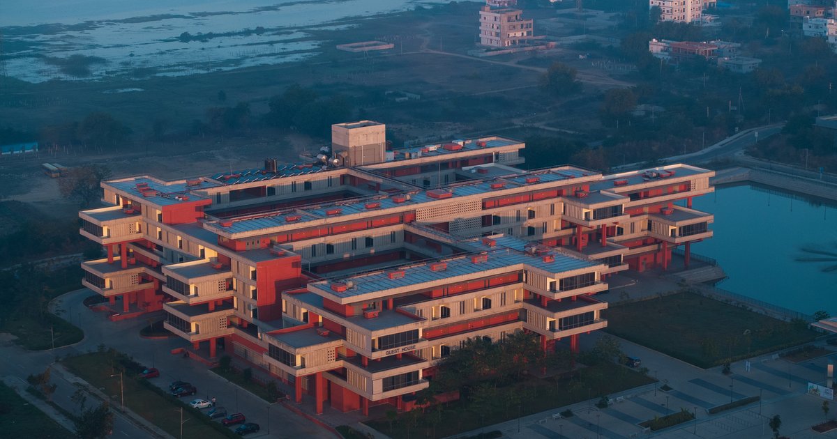 A Tokyo-Indian team built a 30,123 m² guest house at IIT Hyderabad, layering concrete, red columns and stepped balconies around shaded courtyards.