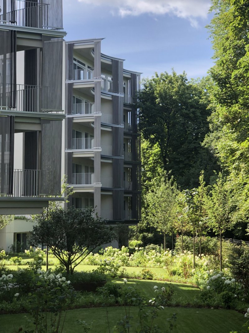 Large glass paneling and silver blinds on the balconies allow for panoramic views of the historic park, creating a seamless blend between the interiors and the external environment. This design choice emphasizes the architects' vision of luxury that interacts with nature rather than overpowering it.