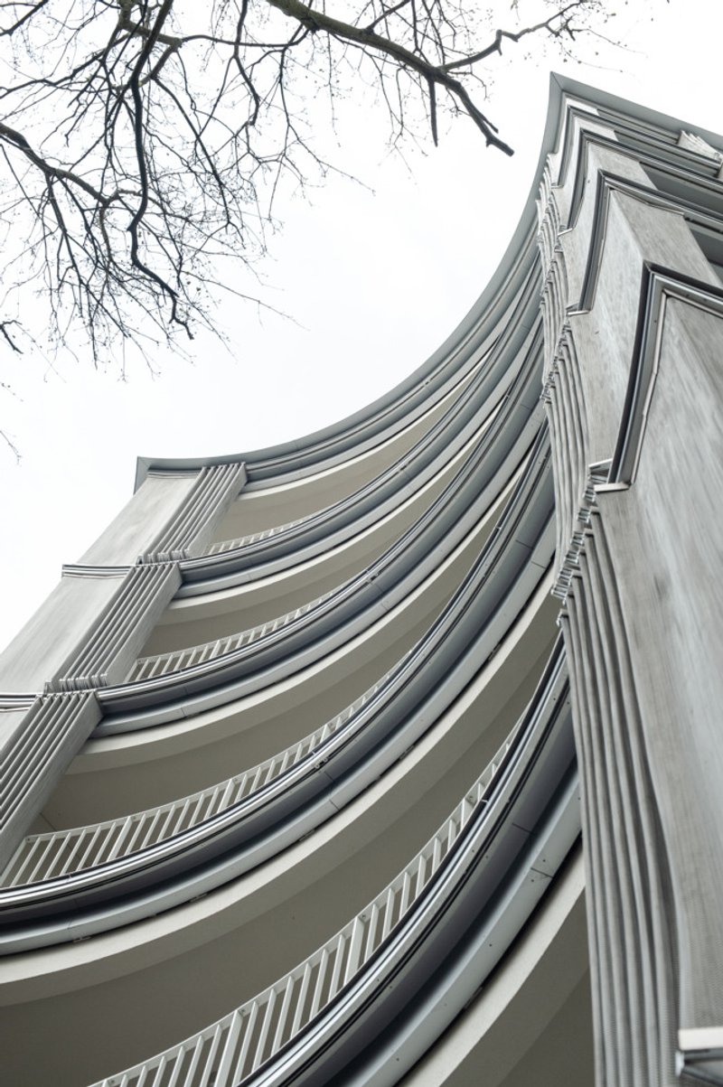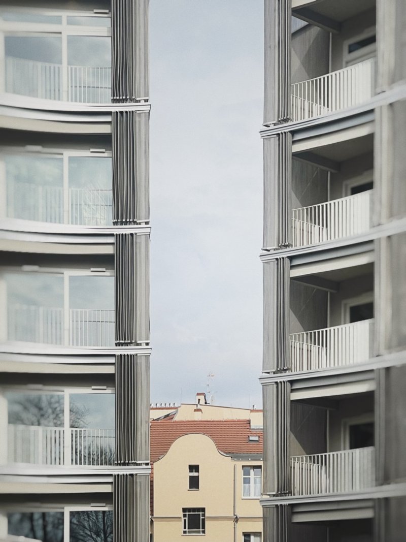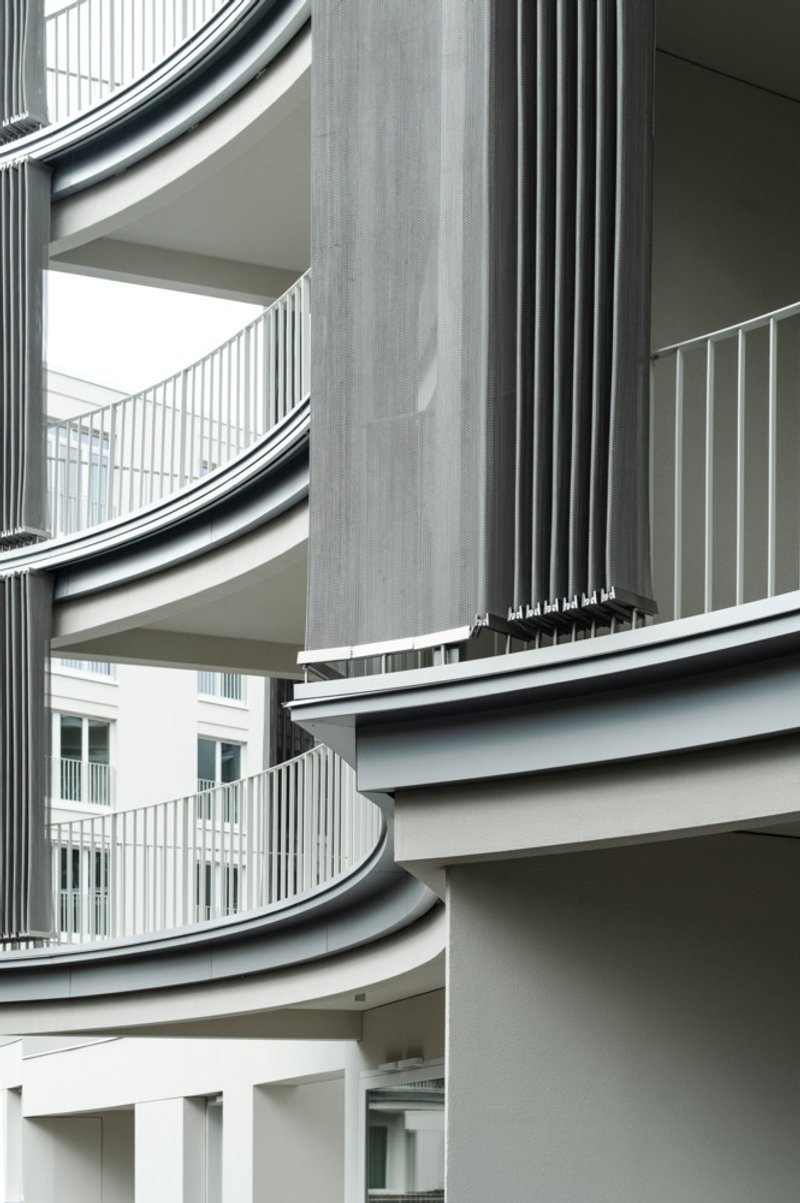 The loggias at Perfumiarnia are notable for their large, arching handrails and remote-controlled, semi-transparent steel net curtains. This innovative feature allows residents to modulate their level of privacy and interaction with the environment, providing a mystical sensation as described by the architects.