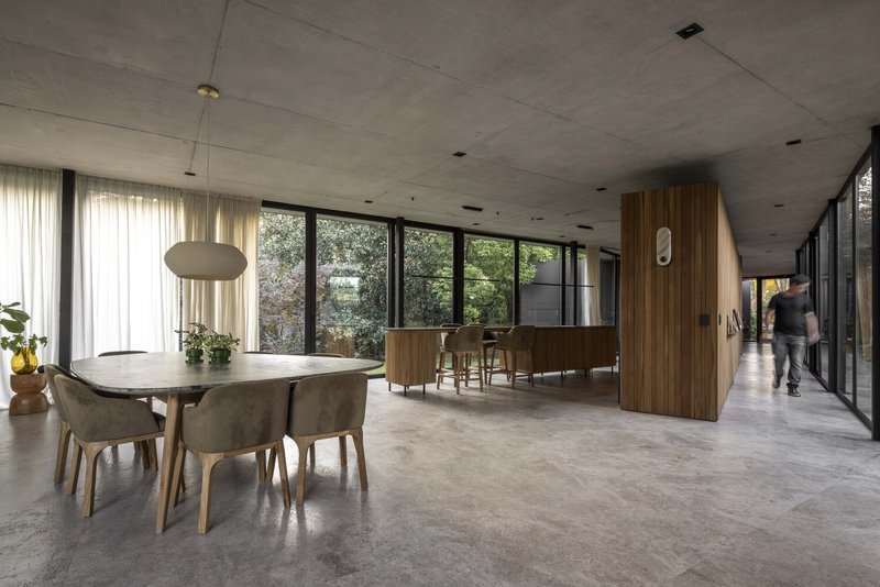 Each of the house's areas is carefully oriented to enhance privacy and create strong visual and physical connections with the outdoors. Bedrooms open to enclosed spaces with protected views, while the kitchen faces a landscaped area that offers an intermediate scale between the private and public realms. The living and dining areas, along with the barbecue area, open to expansive green spaces that offer views of the pool and the golf course. This strategic layout ensures that each space feels private while maintaining a sense of openness to nature.