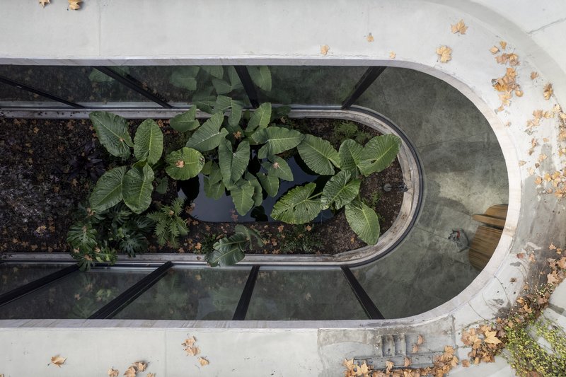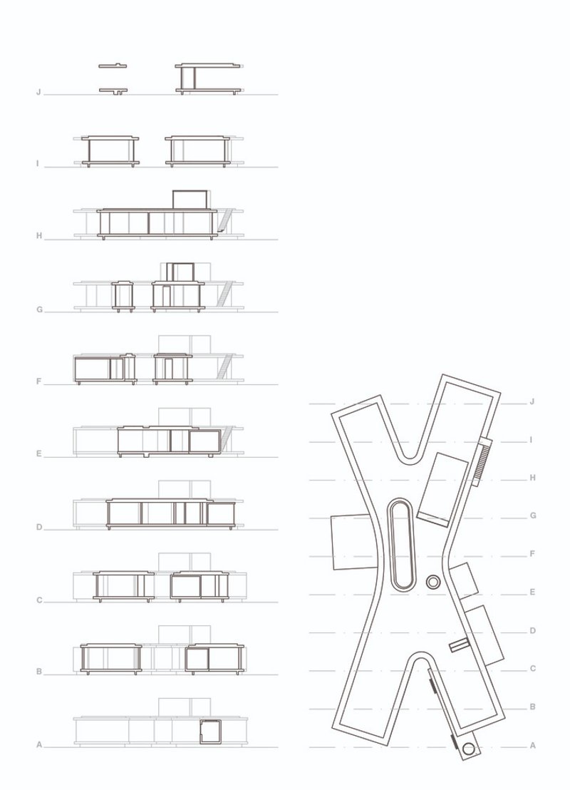 The design of the house revolves around the X-shaped floor plan, which divides the home into four distinct areas: a private family area, a common family space, a social area, and a garage/service sector. These areas are linked by an internal courtyard, which serves as the core of the house. The courtyard, filled with plants and a tree, provides light and ventilation while connecting each section of the house to the outdoors.