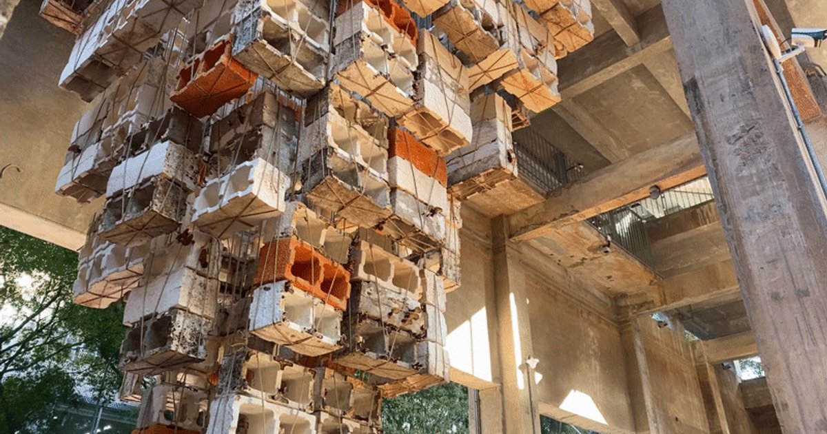 The installation adopts an inverted-pyramid form, challenging traditional architectural perspectives and illustrating concepts of duality—man-made versus natural, present versus future, growth versus decay. Within this structure, 400 hanging mycelium bricks form the primary material, embodying innovation, sustainability, and circular design principles. Grown from agricultural waste, including straw, bagasse, and wheat bran, these bricks are renewable, biodegradable, and capable of adapting to the space while offering structural strength and malleability. Over time, the bricks can return to the soil, completing an environmentally responsible lifecycle with no residual ecological burden.