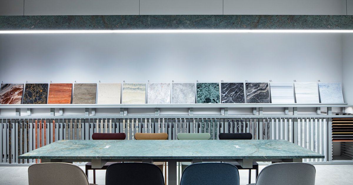 The ISHIMIRAI Lab Showroom reimagines marble's future, blending innovation, design flexibility, and collaboration in a dynamic architectural space.