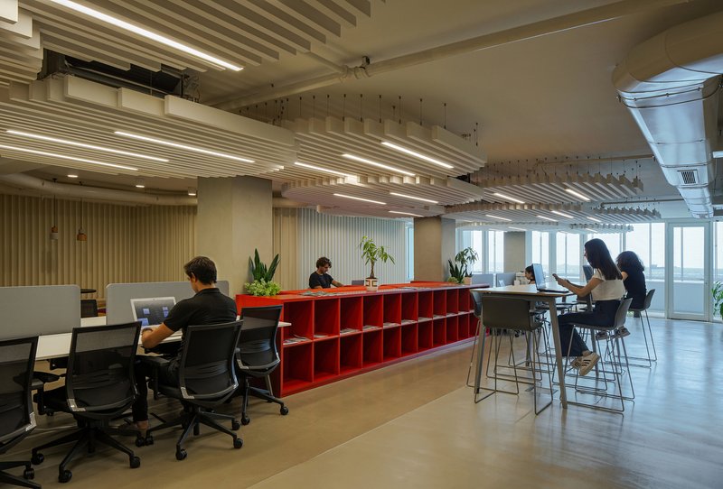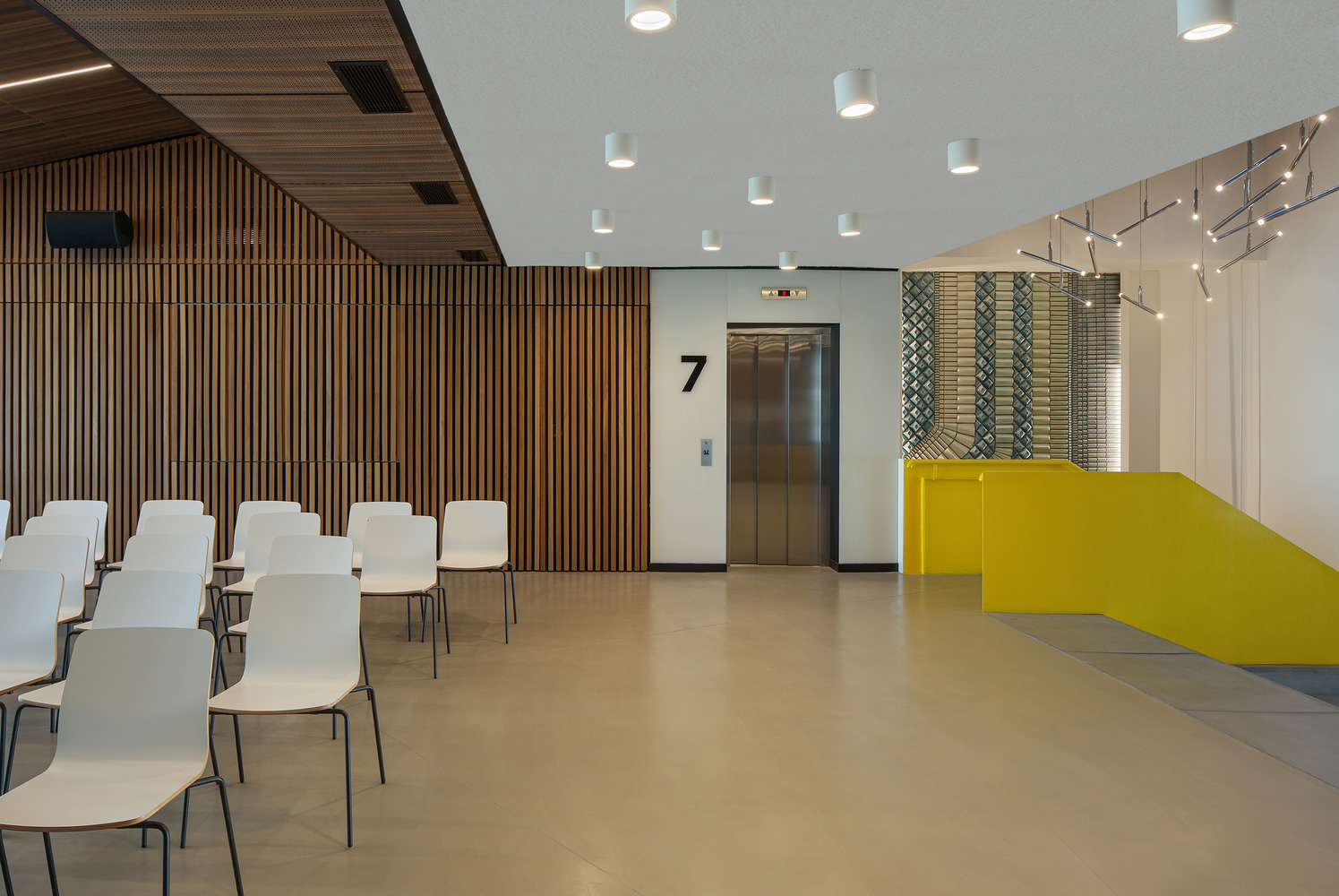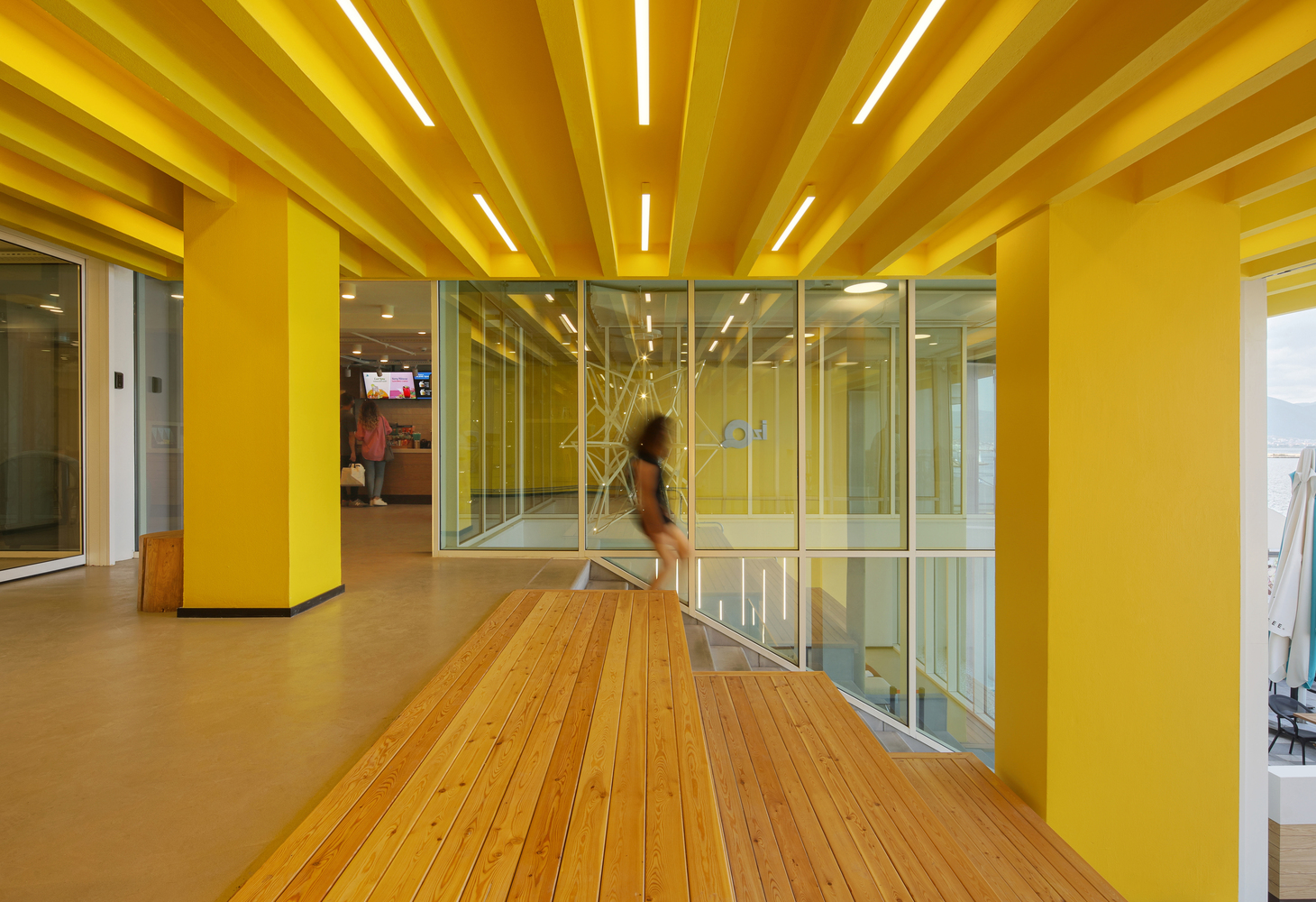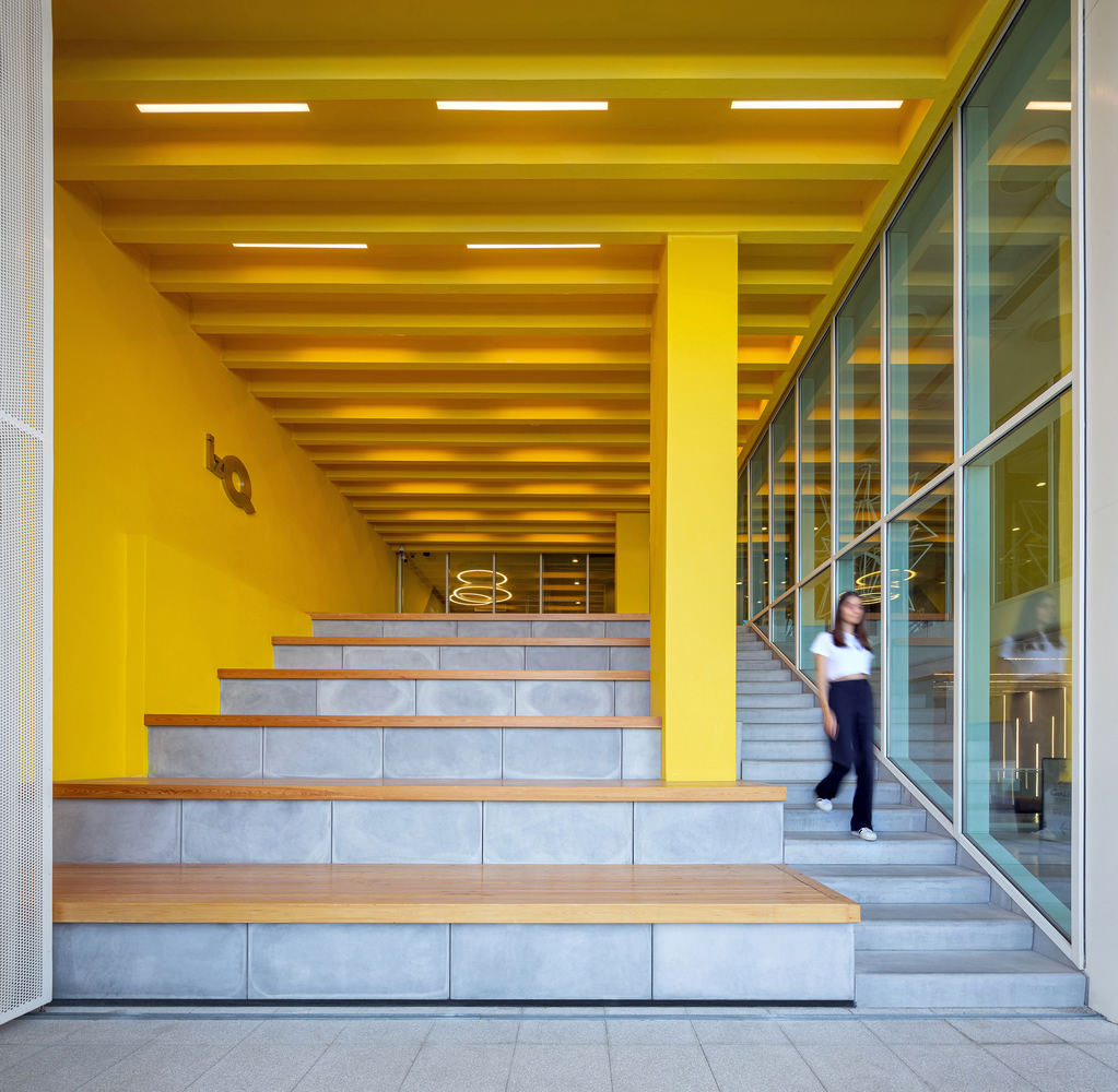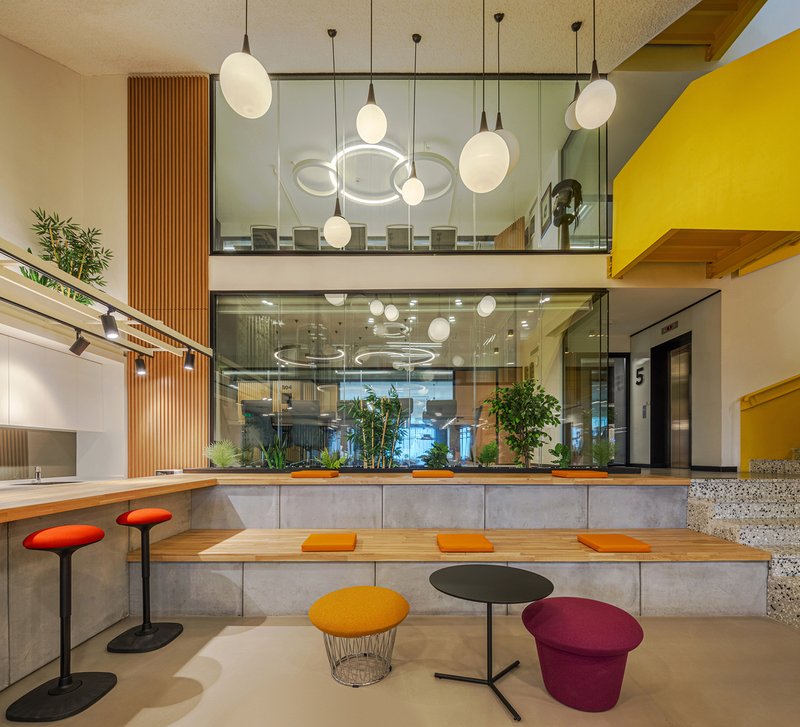 Working within the limitations of the existing concrete frame, Ofisvesaire employed a series of innovative interventions to renew the building’s spatial and structural logic. The most striking element — the yellow vertical circulatory spine — anchors the new design. It enhances spatial communication and embodies the idea of connectivity and co-existence, encouraging encounters among users at every level.
