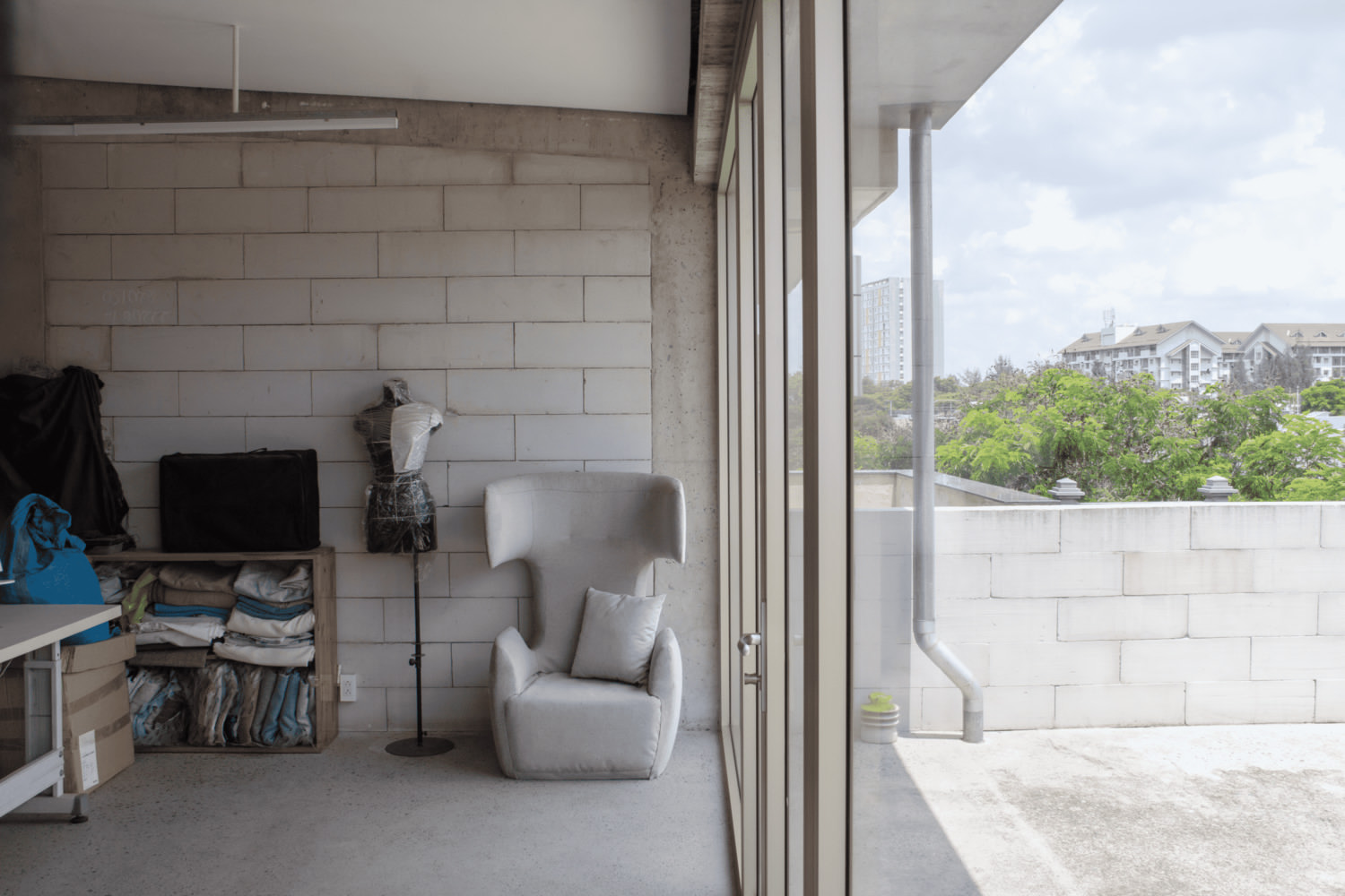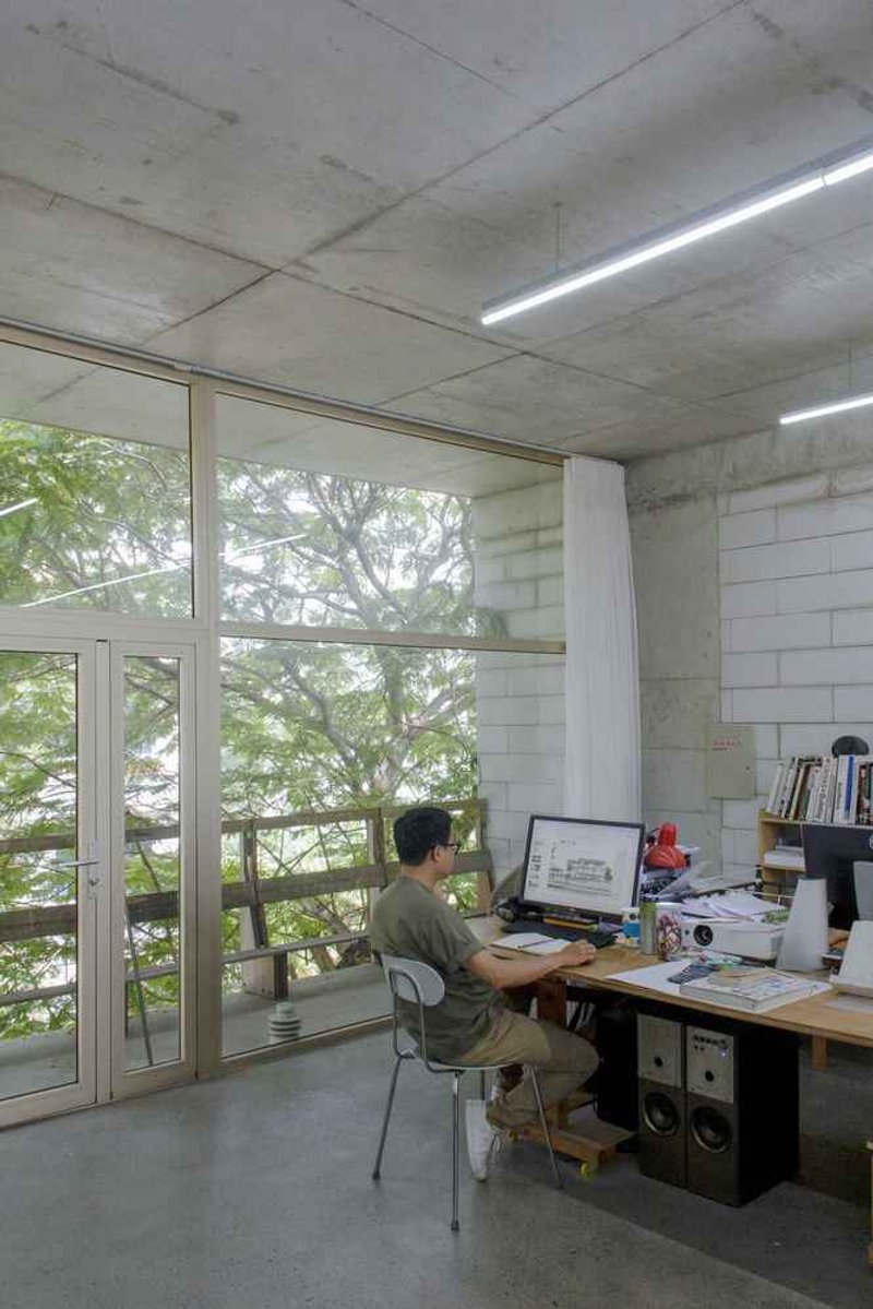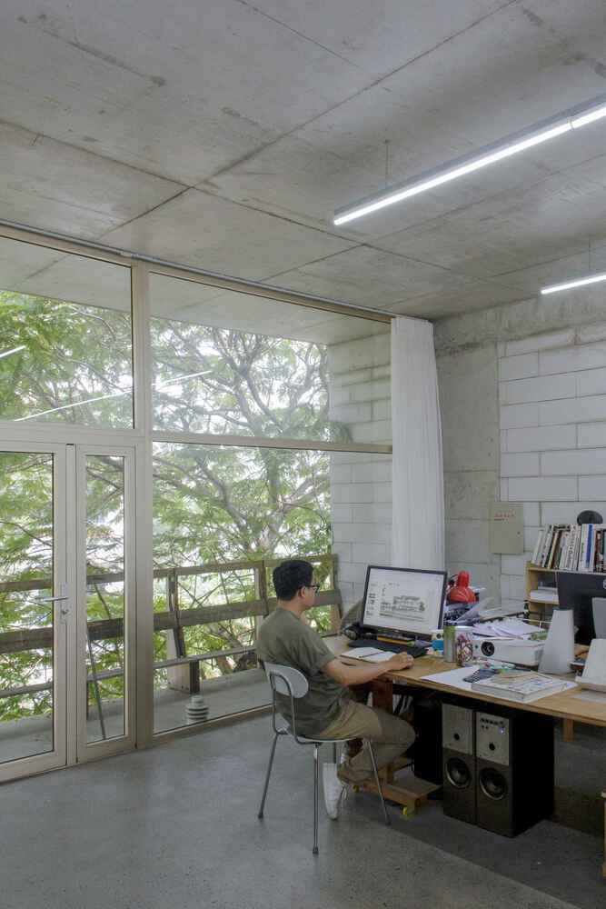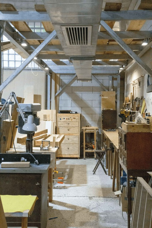 Interior spaces retain a raw, industrial character, highlighted by exposed concrete, steel beams, plywood surfaces, and minimal detailing. This honest use of materials reinforces the studio’s design philosophy while providing functional clarity within each work zone.