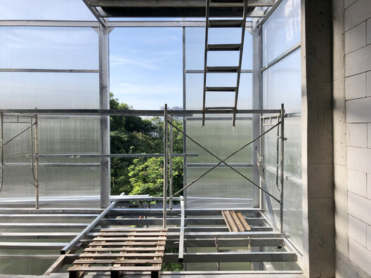 One of the building’s defining features is its transparent polycarbonate wall system. Installed across both sides of the structure, the polycarbonate layers infuse the interior with abundant daylight, reducing the need for artificial lighting and enhancing visual connectivity with the surrounding green landscape. This translucent façade softens the boundary between interior and exterior and contributes to natural ventilation, lowering energy consumption.