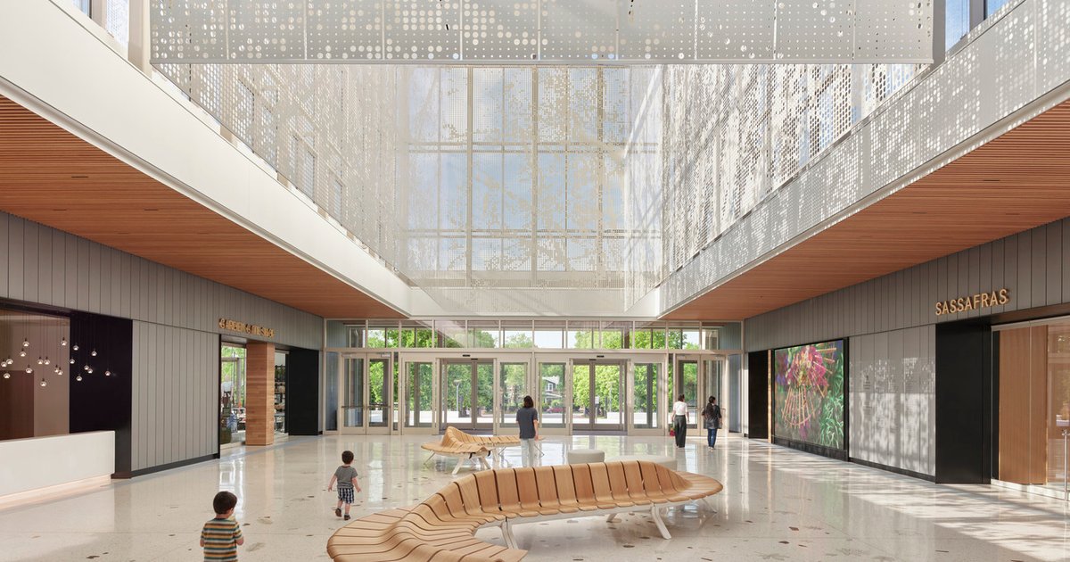 The center’s iconic lantern feature, suspended from the ceiling, adds an enchanting touch. The lantern’s perforated pattern, inspired by tree canopies, filters dappled light into the lobby, simulating the experience of walking through a wooded clearing. At night, the lantern glows, welcoming both visitors and the local community.
