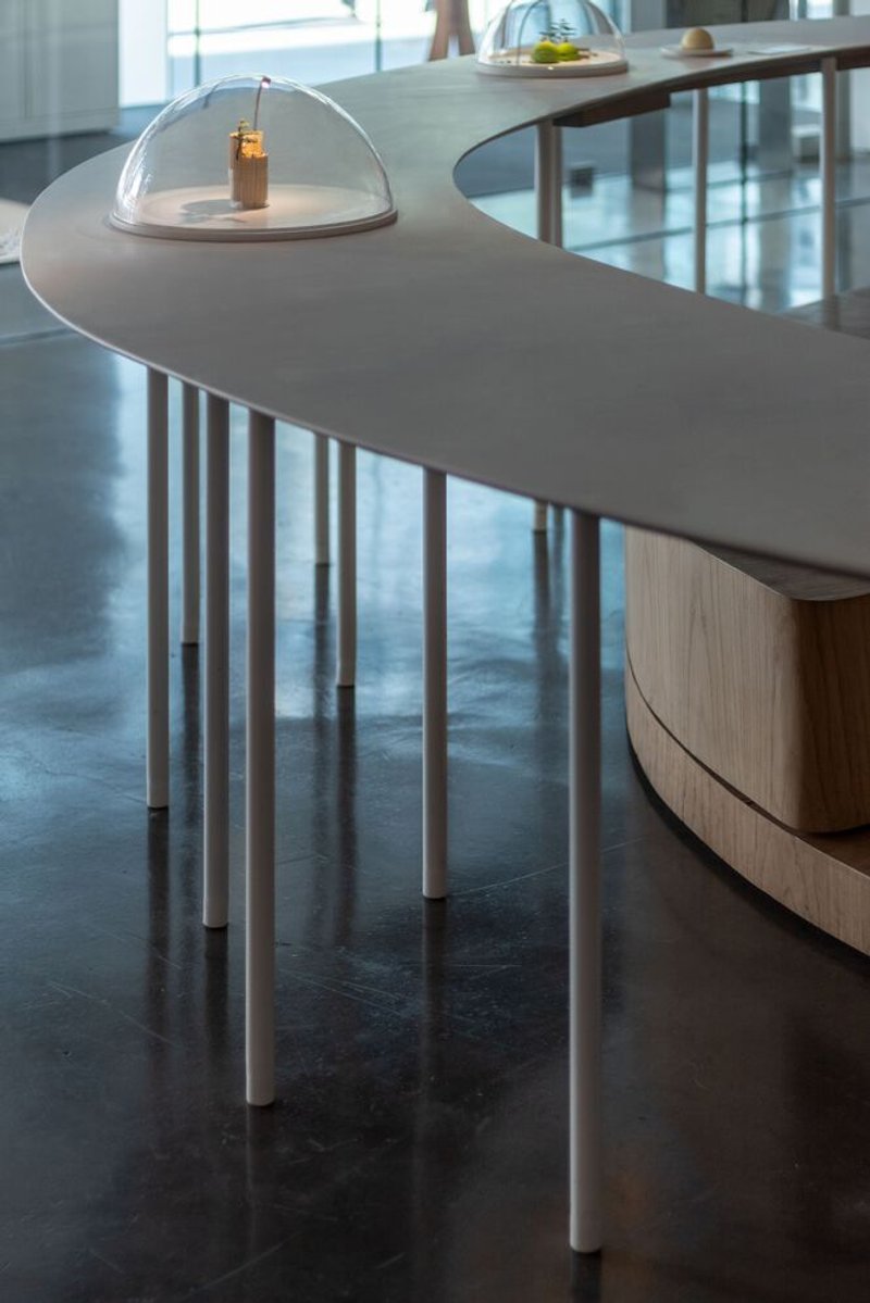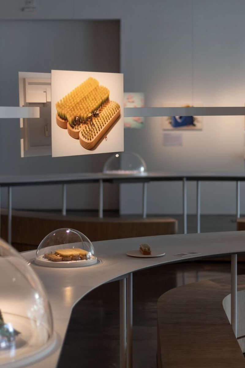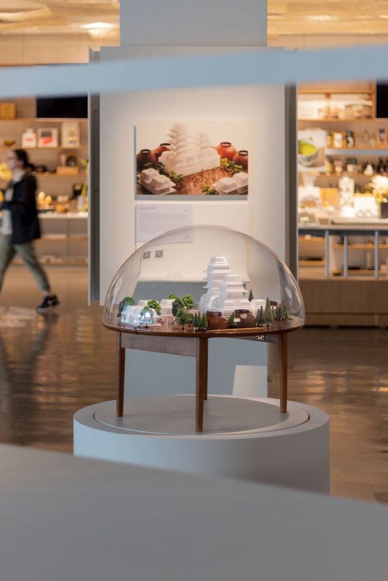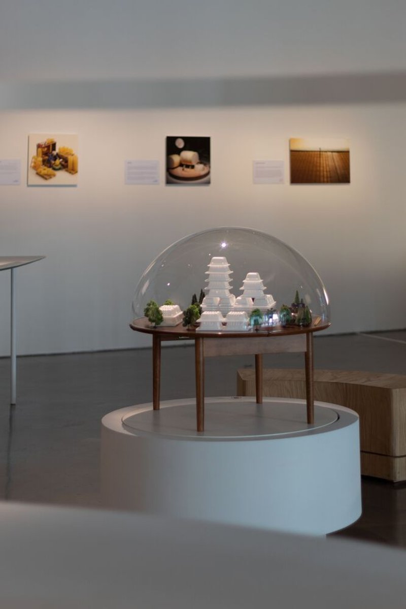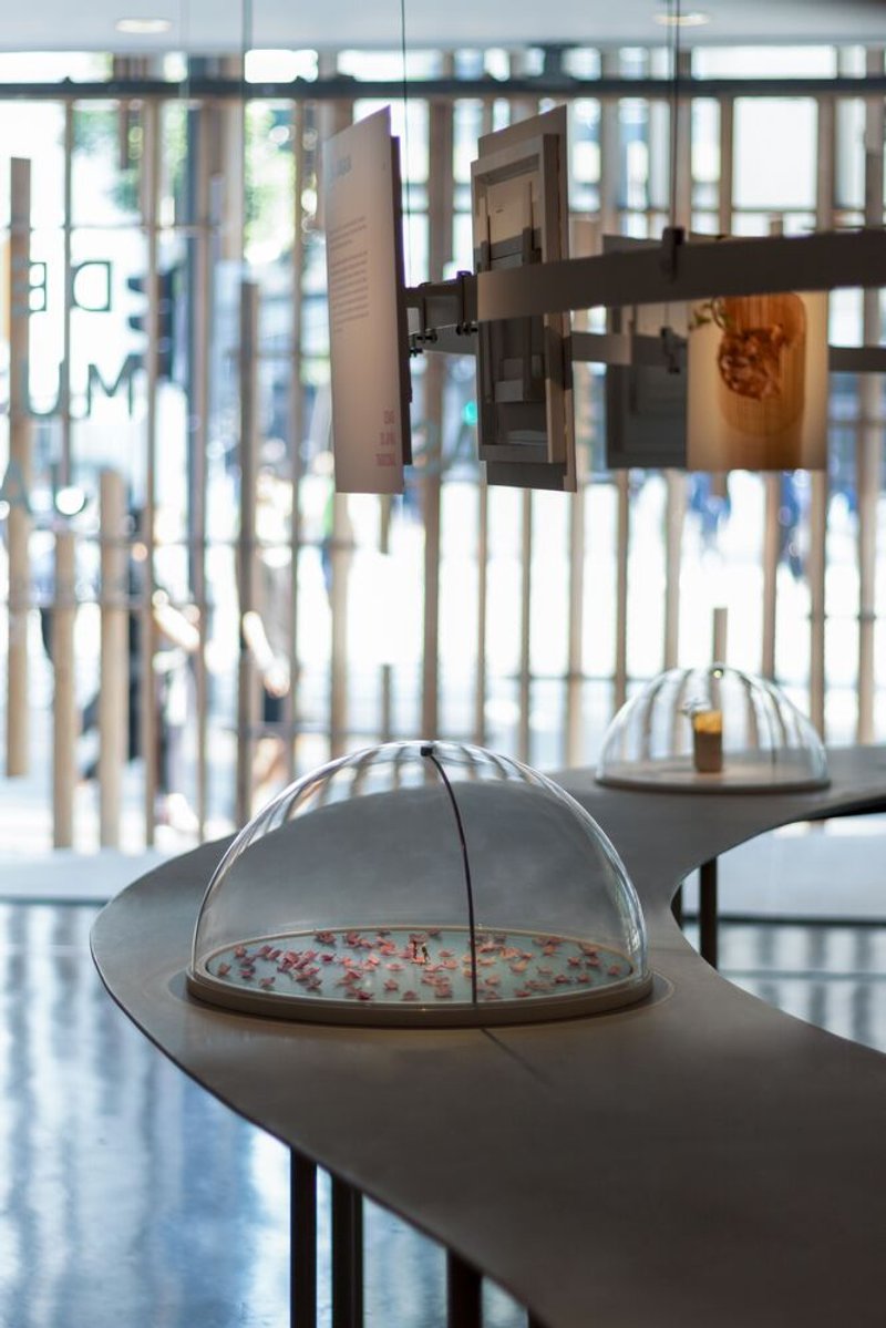 Collaborating with Tanaka, FGMF Architects crafted the exhibition space to complement and enhance the miniature artworks. The design features two curved counters with domes under which the sculptures are displayed. These setups are not only visually striking but also functional, allowing visitors to view the artworks from various angles and in constant motion, thanks to rotating bases.