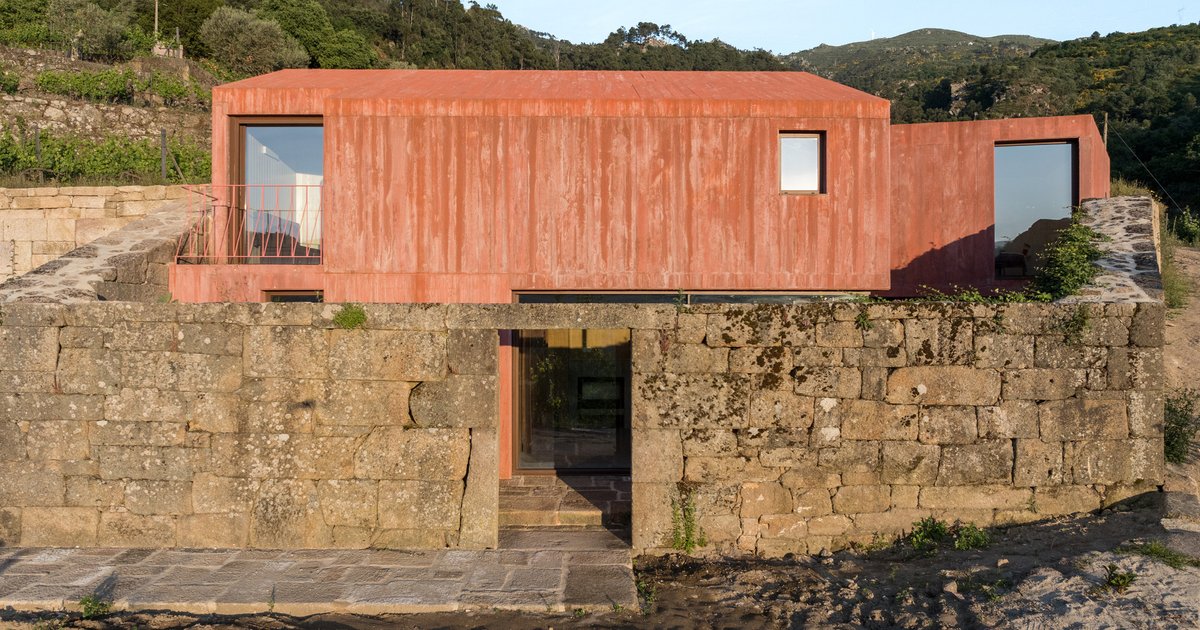A pink concrete vacation home in Portugal blending restored granite walls, vineyard landscapes, and modern volumes to create serene indoor–outdoor living.