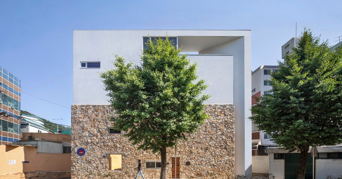 Nestled at the edge of Mudeungsan National Park and the bustling heart of Gwangju, the Jisan Stone House by PLAN Architects Office (2022) harmoniously bridges nature and urban life. Situated on a triangular plot accessible via a serene two-lane road lined with tall ginkgo trees, historic residences, and urban shops, this residence maximizes a modest usable area of 62.73m² while responding creatively to local road widening regulations and landscape setbacks.