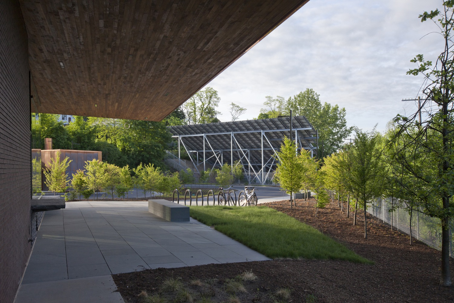 The surrounding landscape, designed by GroundView LLC, features xeriscaping—a water-efficient planting strategy that reduces irrigation demand and supports local ecology. The hardscape and softscape are fully integrated with the building design, supporting stormwater management, biodiversity, and urban cooling.