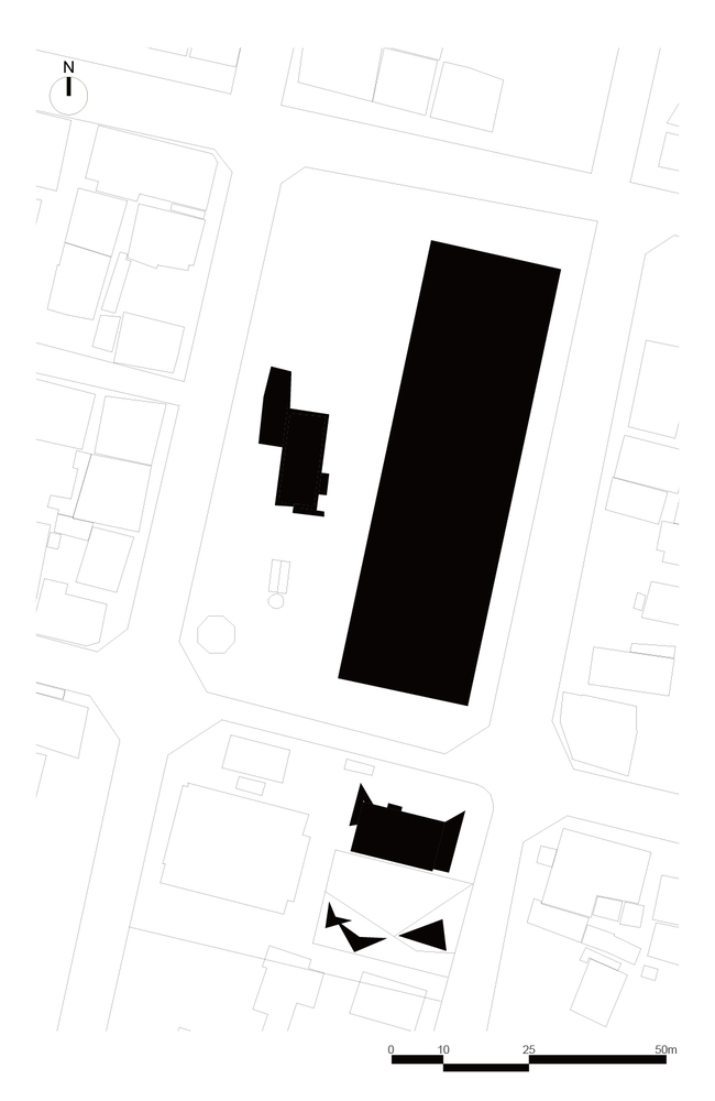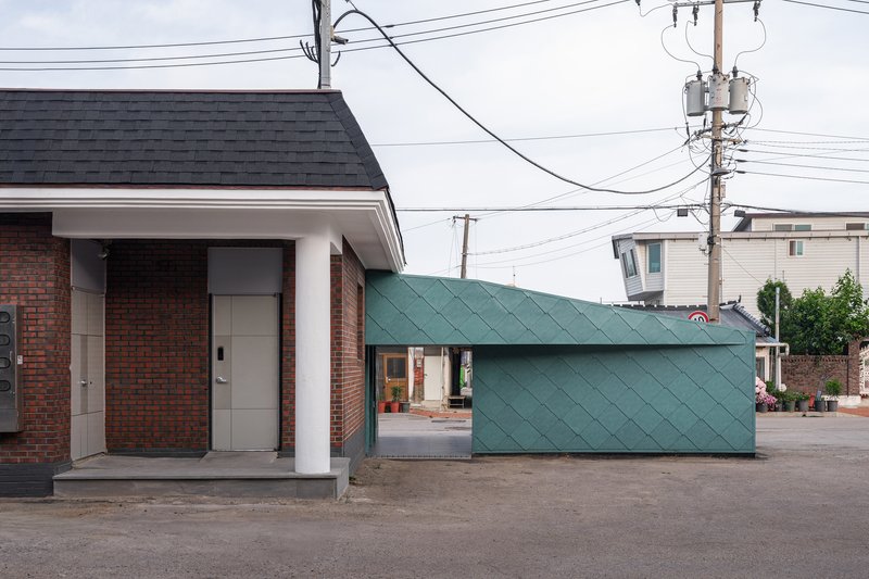 A key aspect of the project is its deliberate use of contrasting forms to challenge the existing urban context. The newly constructed public restroom adopts a low-tech, double-curved roof, wrapped in metallic cladding that visually disrupts the linear arrangement of surrounding structures. This juxtaposition of old and new architecture serves as a mediator between past and present, creating a striking yet harmonious dialogue between the built environment and the community.