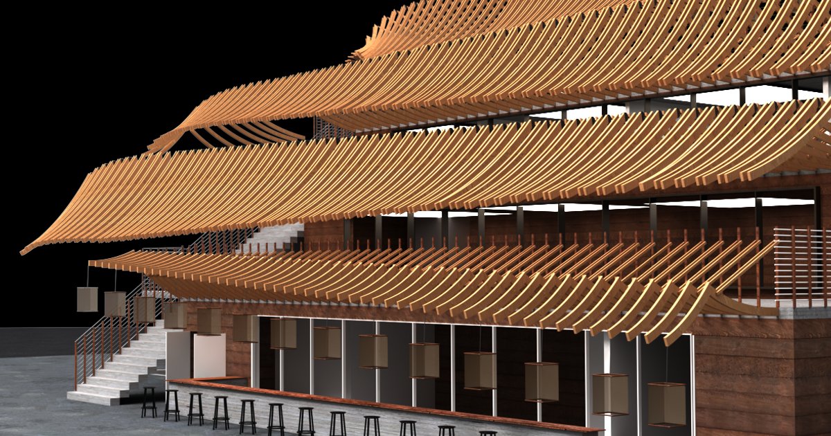 On the third floor are the facilities necessary to run a small scale sake production facility. Its goal is to engage with the public by allowing for views directly into the production space from the outdoor observation deck. By creating an opportunity for experiential learning and direct interaction with the rich story of sake, guests will be able to more holistically appreciate the drink and thus connect with its historical process. Above this, the highest rooftop of the sake house also functions as a patio with views out to the rest of the city, shaded by the proprietary wooden fin system.