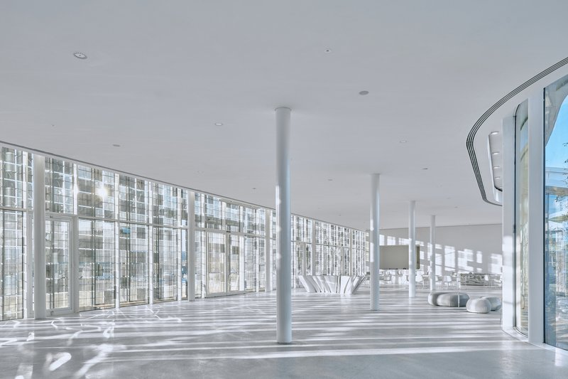 The building’s façade is designed as more than an architectural shell—it forms a dynamic interface between the earth and sky. Featuring 7,200 stainless steel panels at four varying transparency levels, the reflective double-layered façade minimizes solar radiation while responding to geographical orientation and natural light requirements. Its kinetic surface interacts with changing daylight, creating a visually dynamic, passive energy-efficient experience. By night, the façade transforms, revealing interior courtyards and blending seamlessly with the surrounding environment.