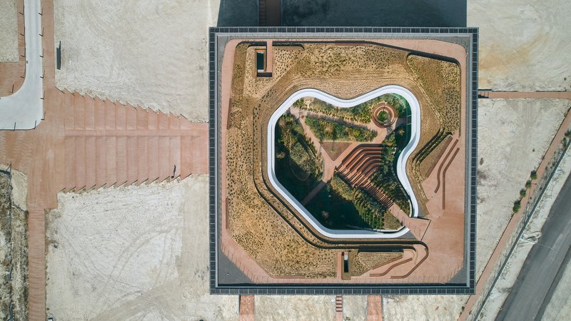 Inside, the Central Control Building fosters human interaction with technology and nature. The foyer and multipurpose areas serve as hubs for panels, workshops, and events, while the interior layout prioritizes flexibility and connectivity. The building’s central courtyard, planted with endemic species that require minimal irrigation, establishes a sustainable microclimate. This green oasis contrasts with the arid surroundings and defines circulation paths, space hierarchy, and the boundary between private and common areas.
