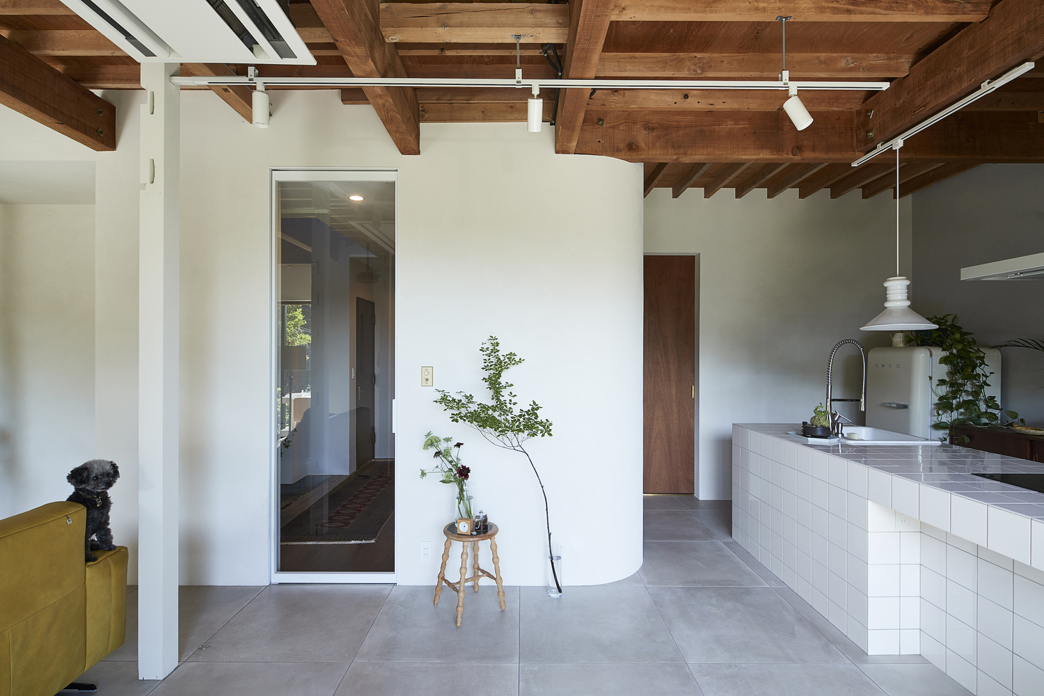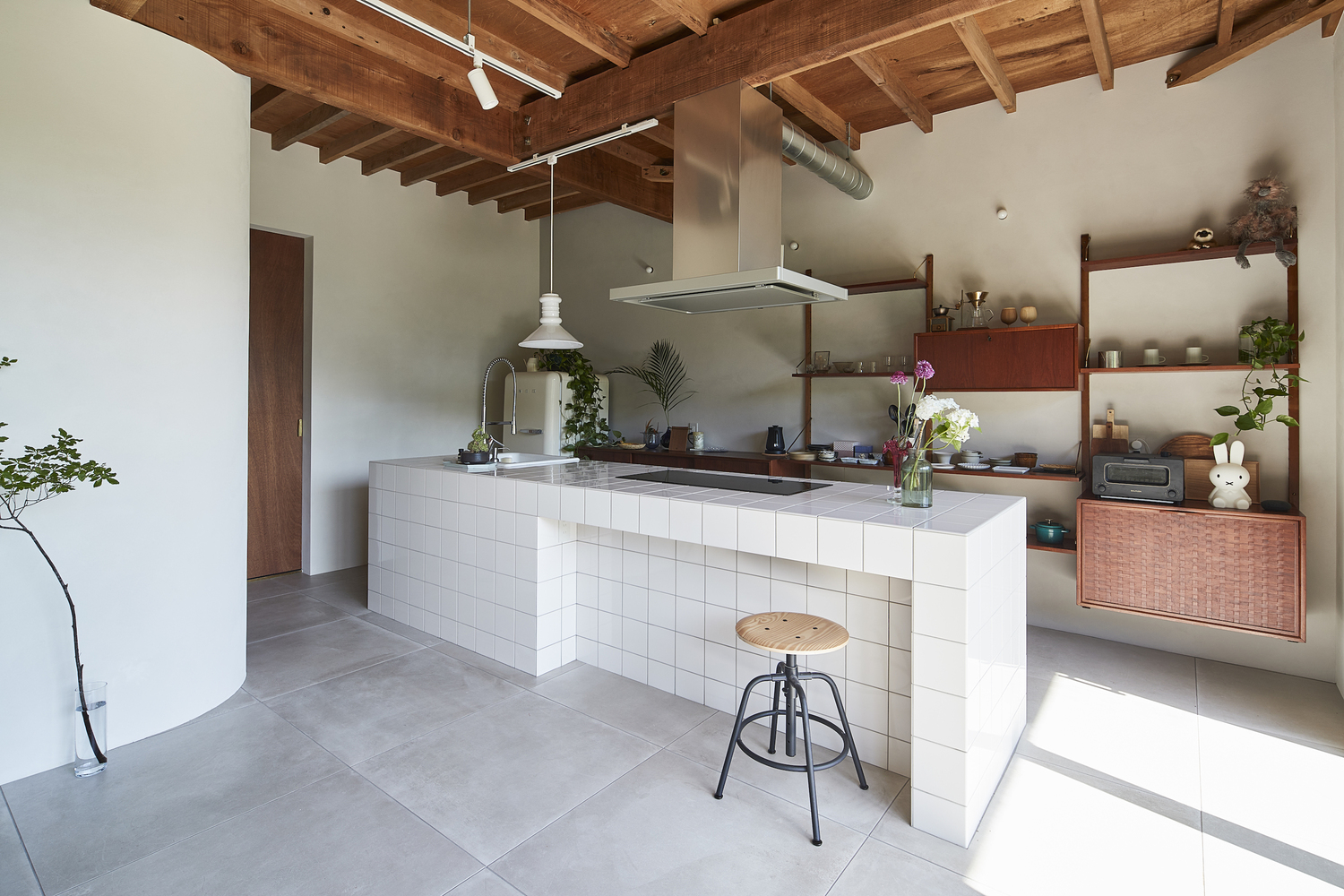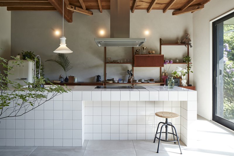 A key design highlight is the kitchen counter, which features nostalgic 10x10 cm white tiles reminiscent of the Japanese modern era. This tactile detail brings a subtle vintage charm to the otherwise modernized space.