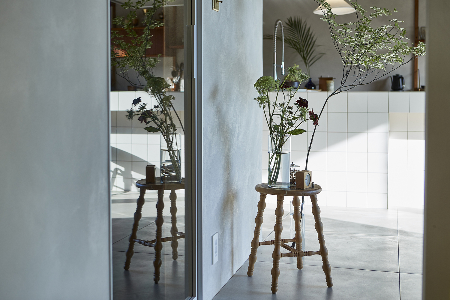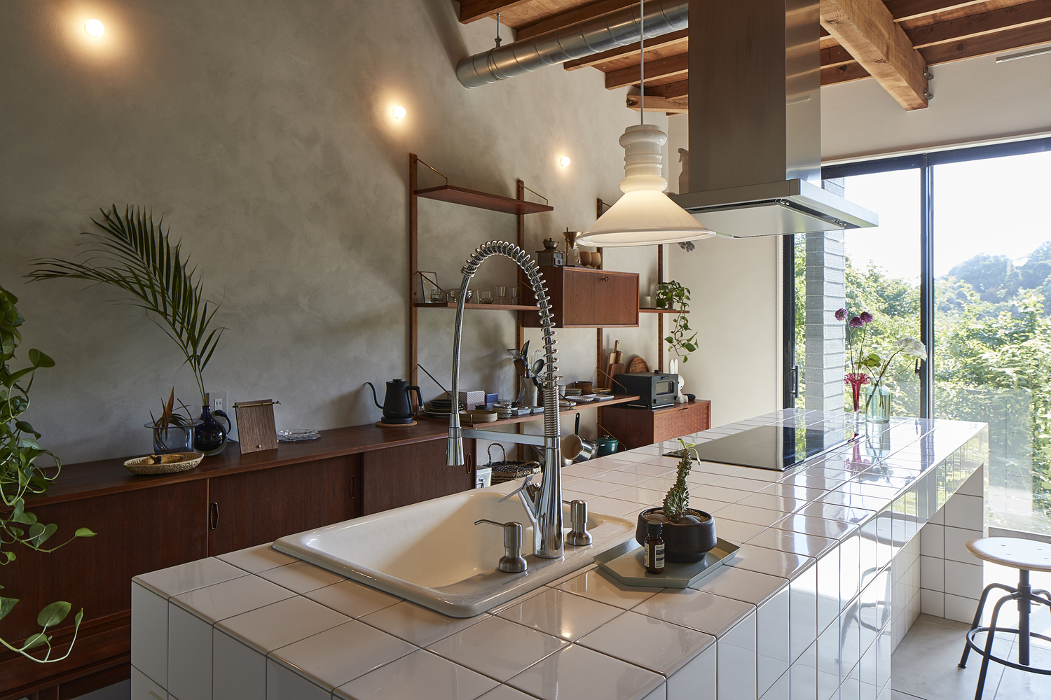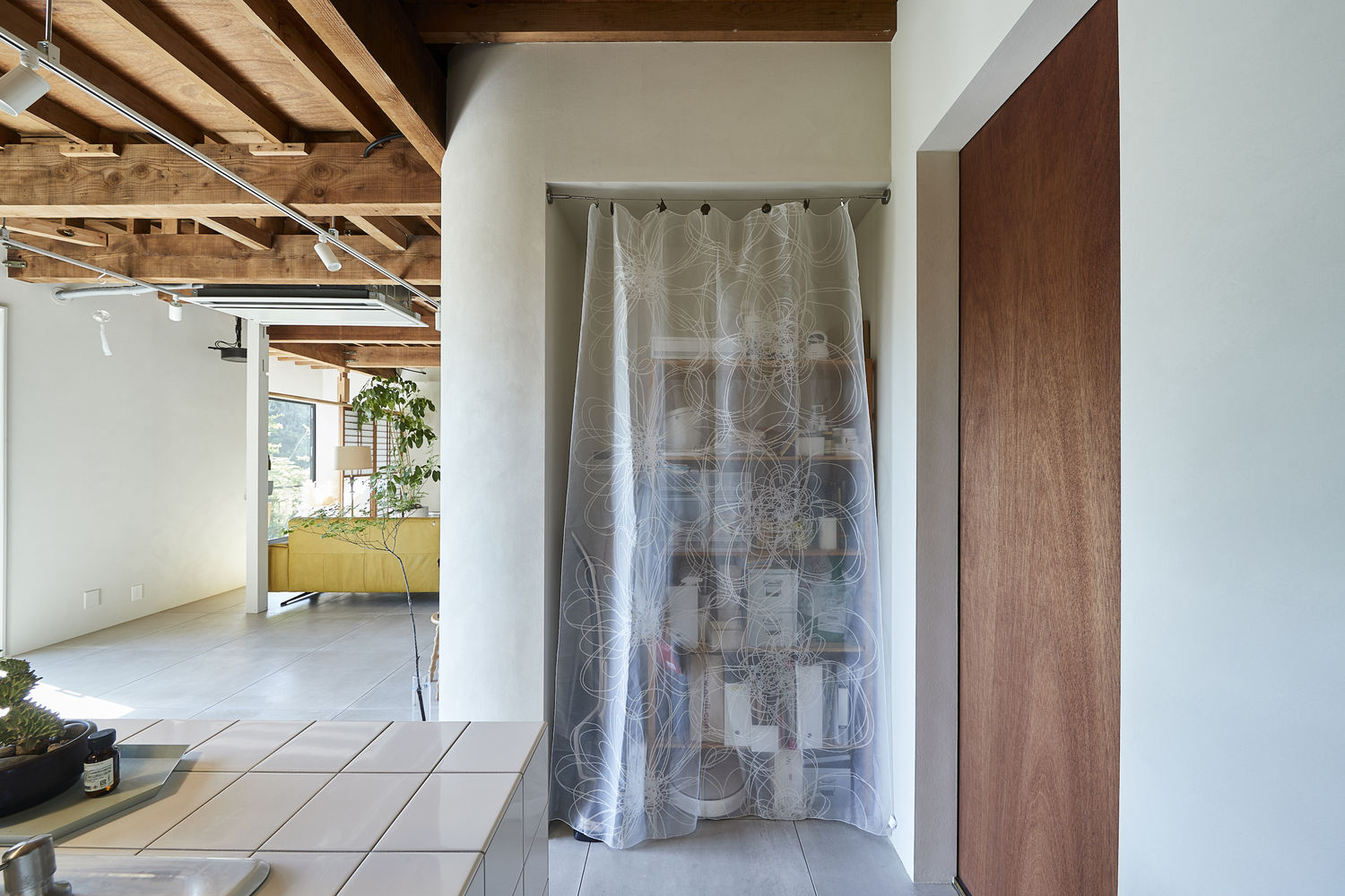 A key design highlight is the kitchen counter, which features nostalgic 10x10 cm white tiles reminiscent of the Japanese modern era. This tactile detail brings a subtle vintage charm to the otherwise modernized space.