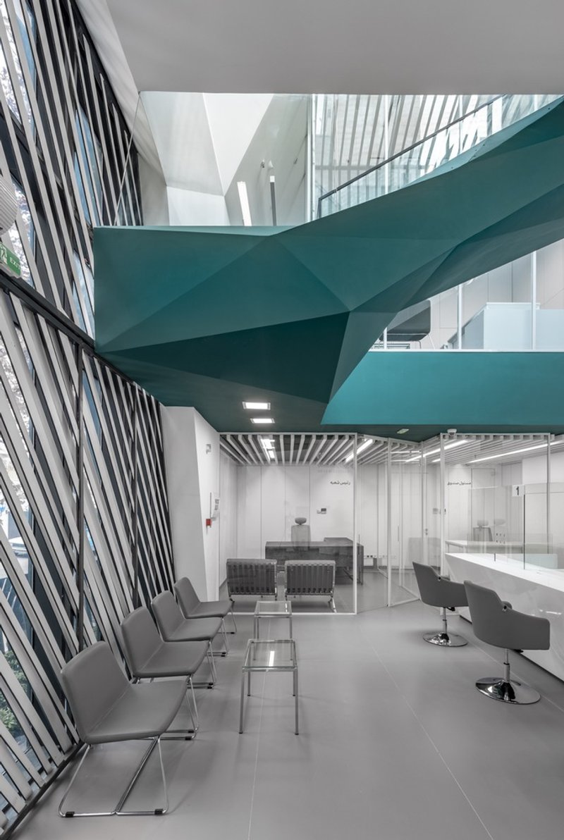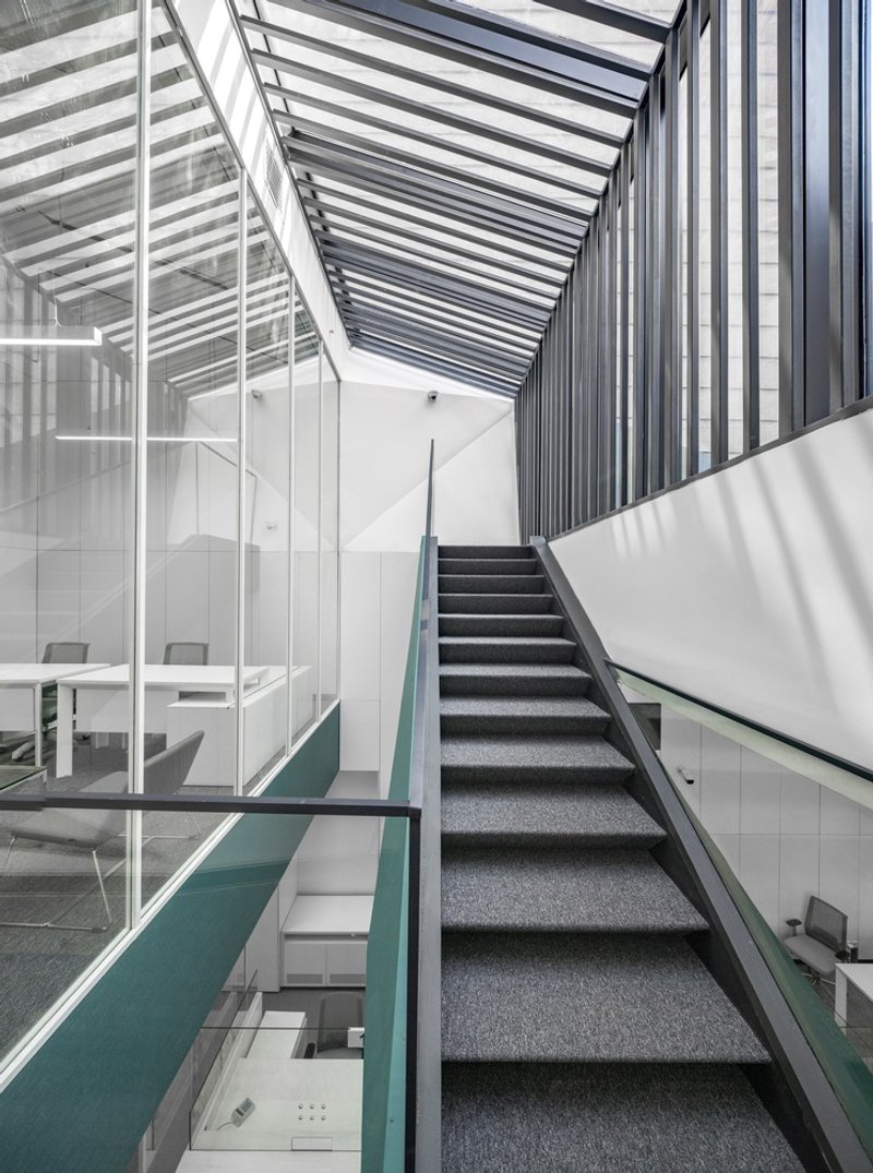 The interior is carefully organized to blur the lines between residential warmth and institutional function. Using mezzanine levels, pitched ceilings, green balconies, and exposed staircases, the designers created a dynamic and open interior layout that feels closer to a contemporary home than a conventional office.
