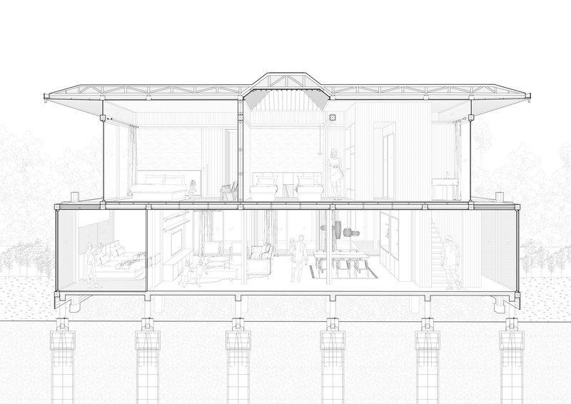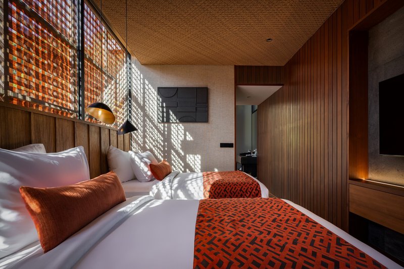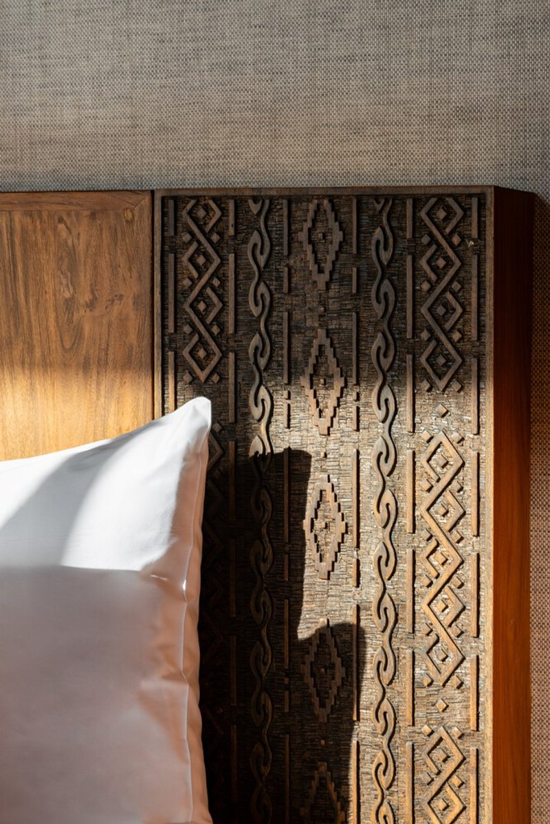 The three-bedroom family villa reflects the principles of vernacular architecture in modern design by adapting to the site’s natural topography. Elevated above the ground, the structure preserves the existing landscape while enhancing ventilation and stability. The wooden framework, crafted from locally sourced aliwowos wood, features intricate handcrafted joints arranged in a precise 3.5-by-3.5-meter grid. These exposed beams celebrate the beauty of traditional craftsmanship while reinforcing the villa’s structural integrity.
